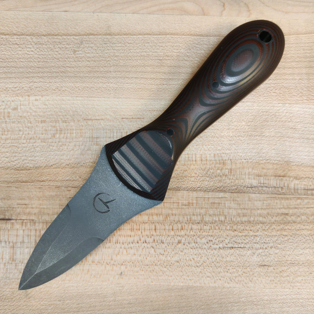 Stainless steel oyster shucker with layered G10 and rubber handle and G10 pins. Comes with padded, zippered pouch.