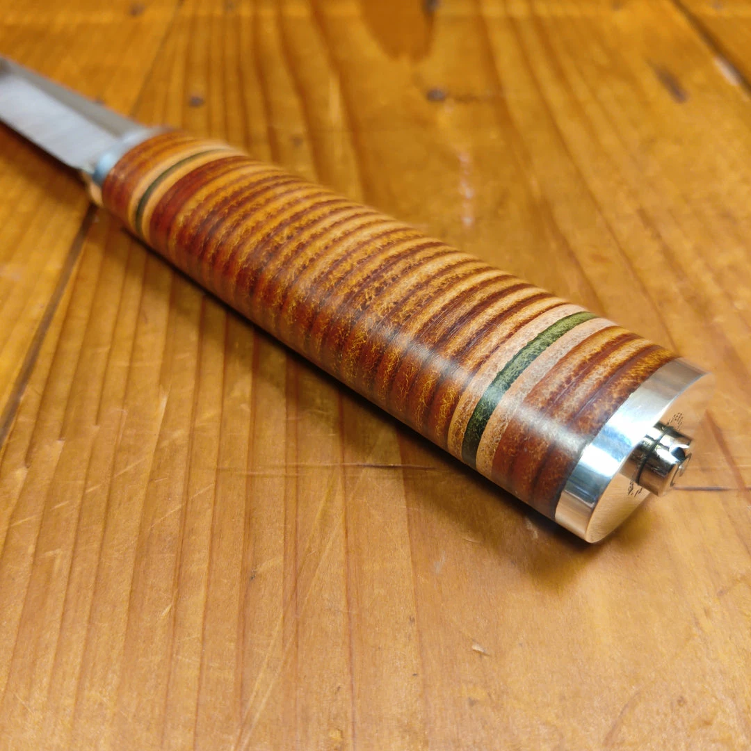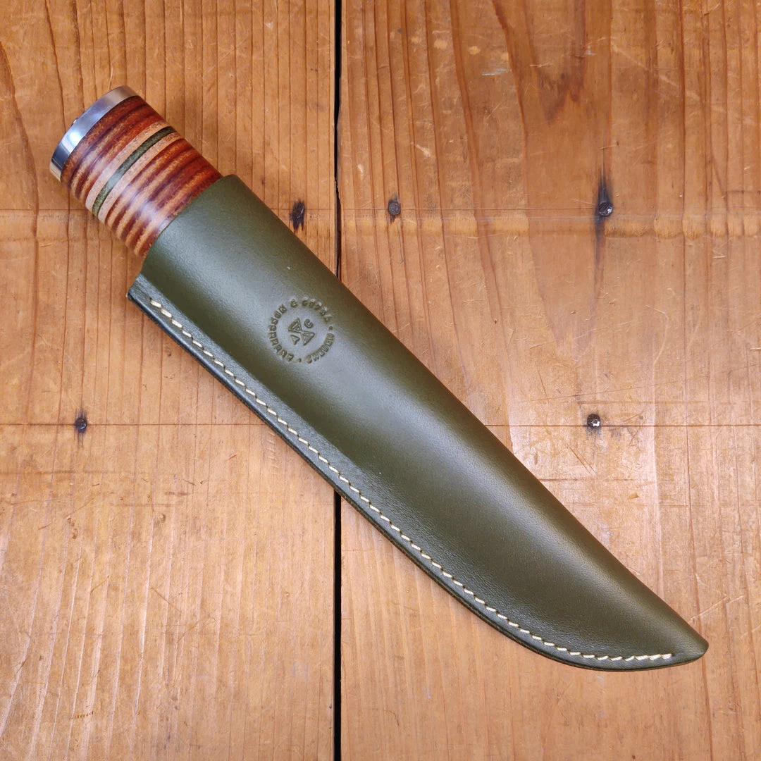 A respectful re-interpretation of the traditional Nordic knife, built entirely by hand to deliver quality performance in the field. The Scandinavian Sportsman Knife No.4 with a stainless steel blade in AEB-L steel and a stacked leather handle. Includes an olive green leather sheath to match the knife.