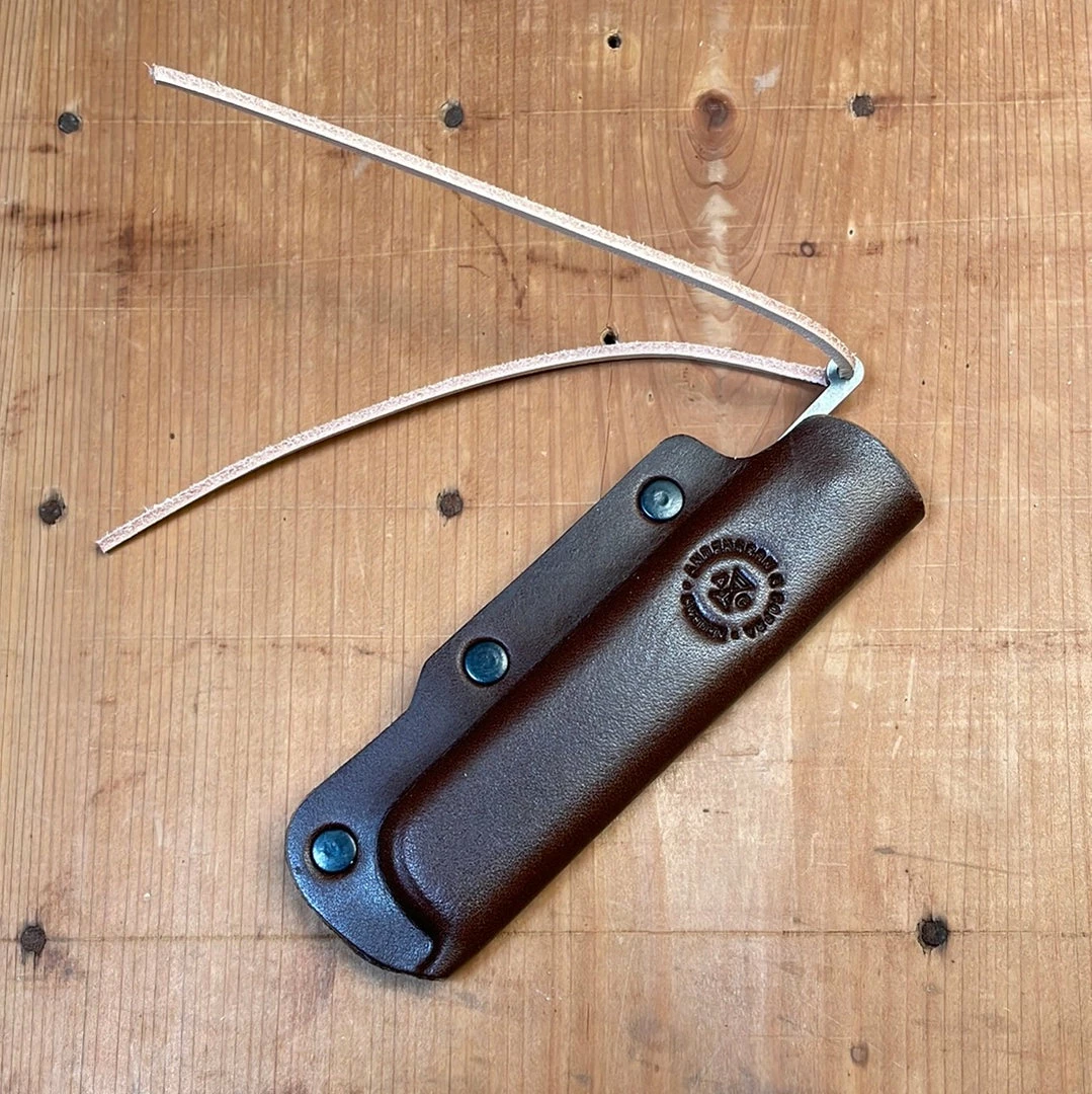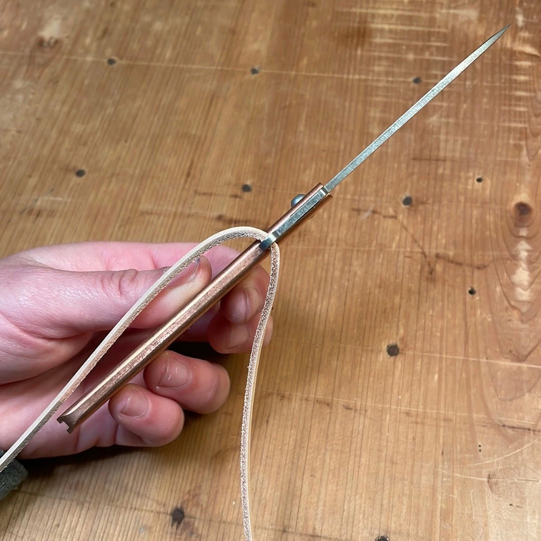 The Urban Husky folding knife with a Sandvik 14C28N stainless blade and a copper handle, including the Huskies wet molded leather pouch.