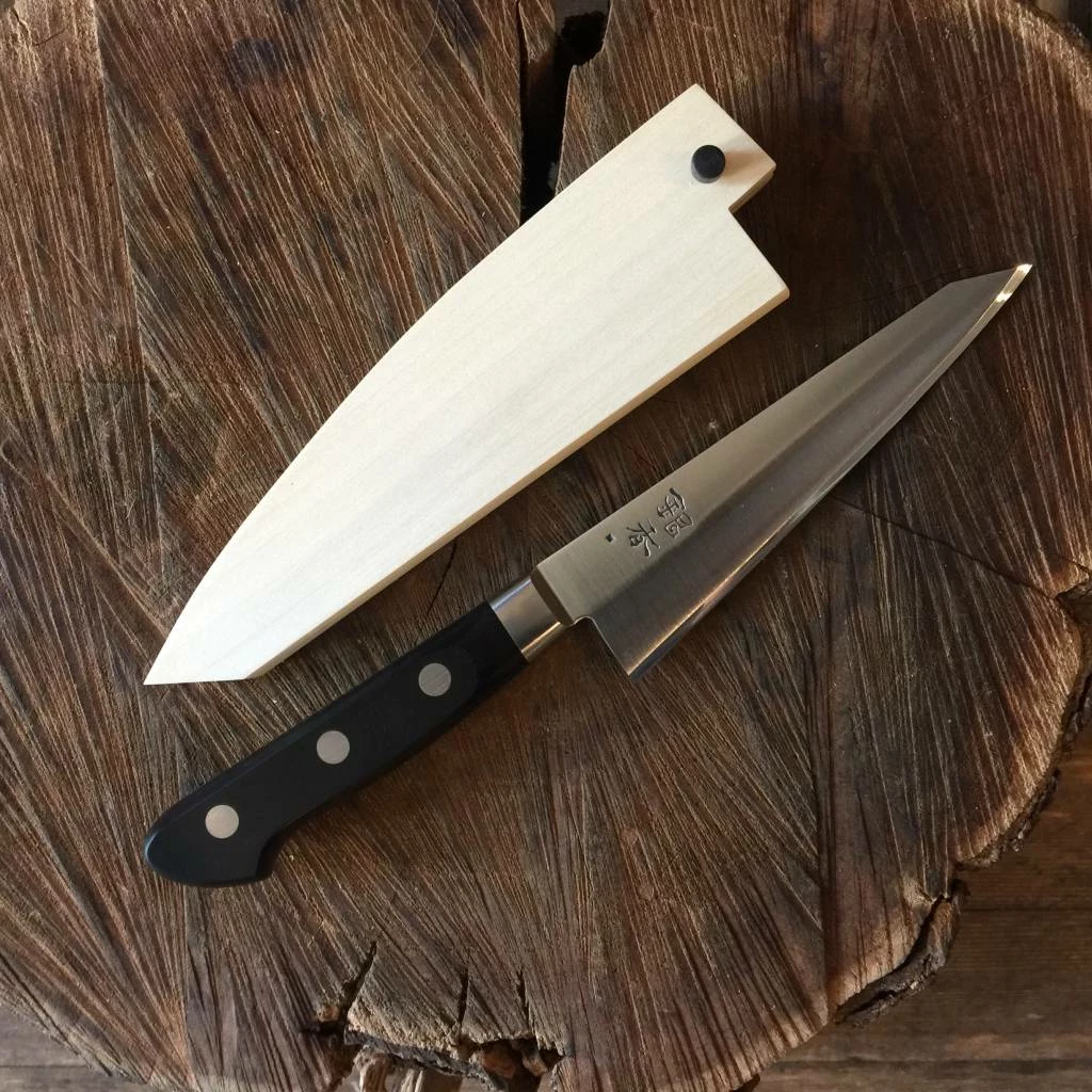 Ashi Hamono 150mm honesuki kaku with with Swedish stainless steel blade and western style riveted pakka wood handle. Saya cover is included. Right Handed.ย