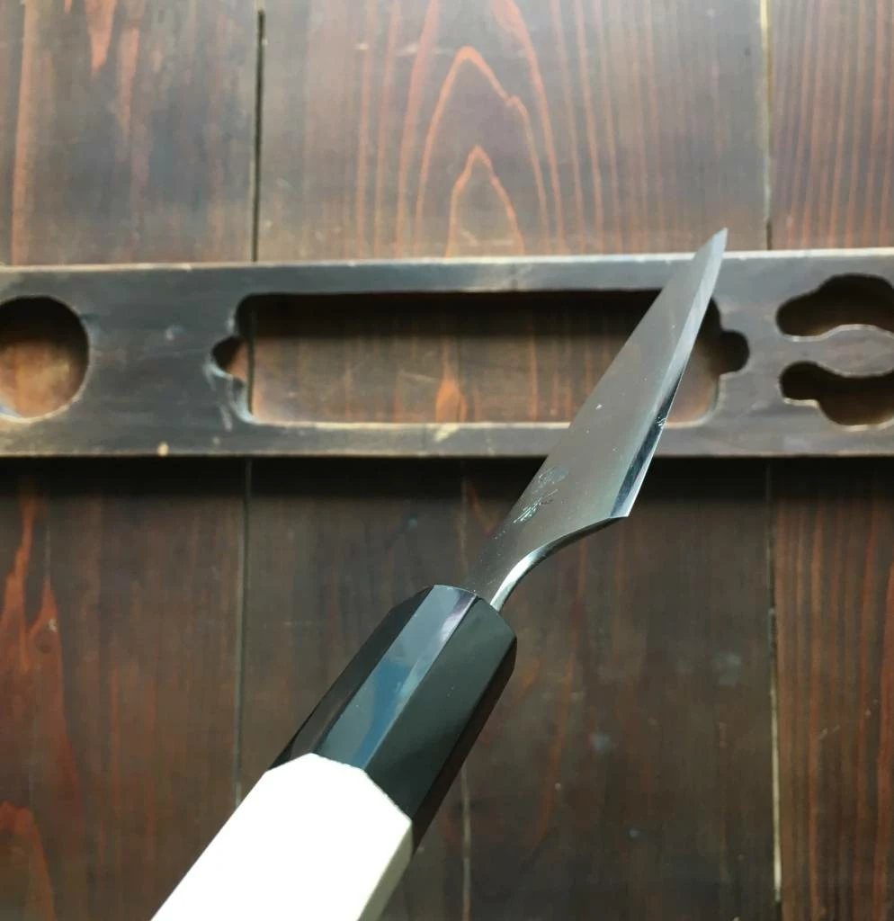 Ashi Hamono 150mm honesuki kaku with Shirogami #2 carbon steel blade. Octagon magnolia wood handle and water buffalo horn ferrule. Right Handed. Saya cover is included.