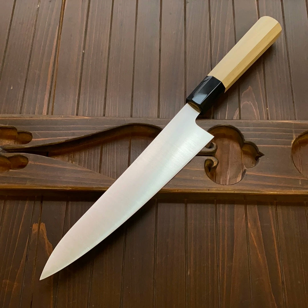 Ashi Hamono 210mm gyuto chef knife with Swedish stainless steel blade. Octagon magnolia wood handle and water buffalo horn ferrule. Saya cover is included.