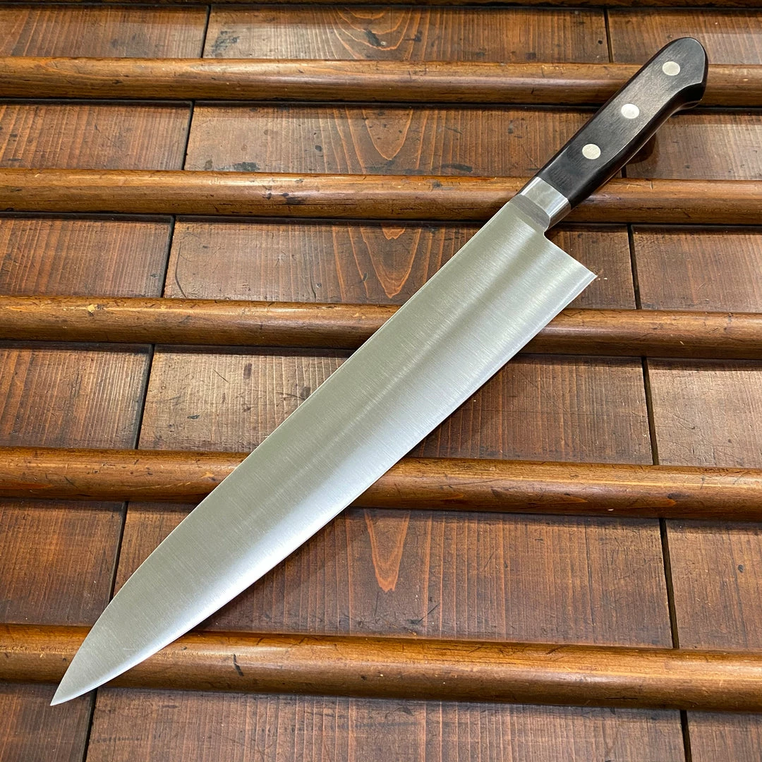 Ashi Hamono 270mm gyuto chef knife with Swedish stainless steel blade and western style riveted pakka wood handle. Saya cover is included.