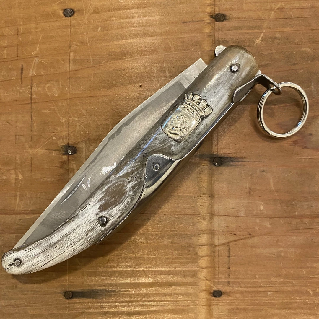 An old Navaja style ring pull / external spring knife with the classic etching of ‘Vendetta Corsa’ and ‘Morte al Nemico ‘ on reverse side etched on the blade; a classic 18th / 19th century style knife, made in Thiers France for Au Sabot with stainless steel blade, external spring, ring lock release and horn handle scales with brass shield.