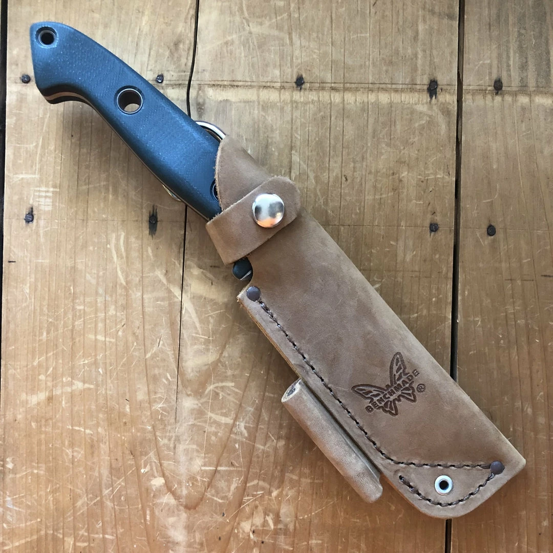 Benchmade 162 Sibert Bushcraft knife with leather sheath. Sturdy 4.4″ CPM S30V stainless powdermetal blade and G10 handle for secure grip. Designed for demanding outdoor multipurpose work.