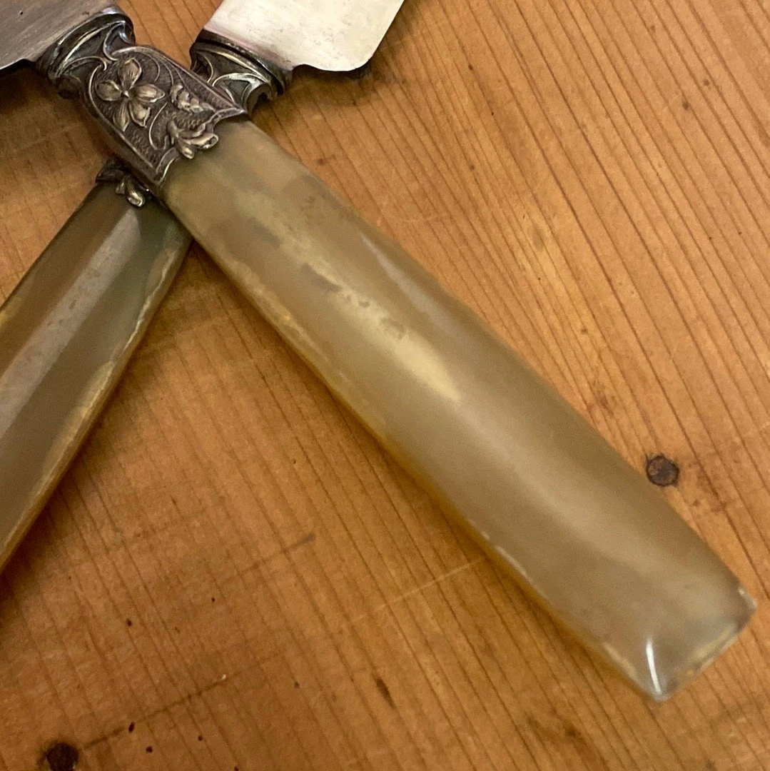 Antique Art Nouveau table knives marked Au Kabile. With carbon steel blades, nickel ferrules and blonde horn handles.ย