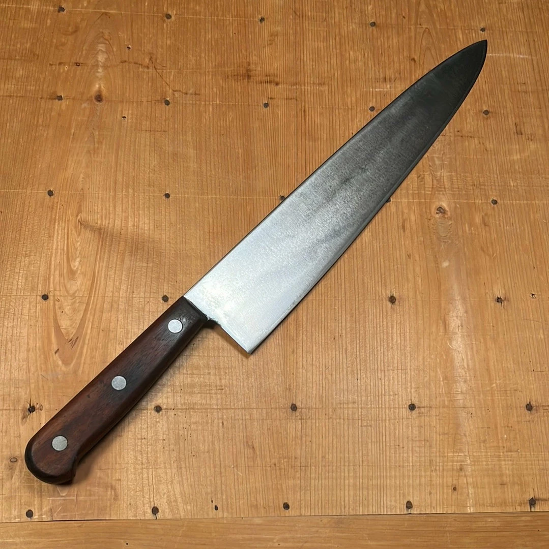 Vintage 12″ carbon steel chef knife by Bear Brand (est 1850) from approx the 1950’s. Carbon steel blade with rosewood handle, blade has been sharpened in some but still has lots of (hard) work left in it.