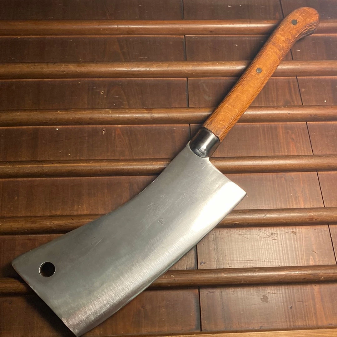 A big one here, hand forged carbon steel with dome shaped steel ferrule (nice and secure, no wiggles) and grooved beechwood handle. Was originally wider but has been thinned and given a good geometry for getting back to work.