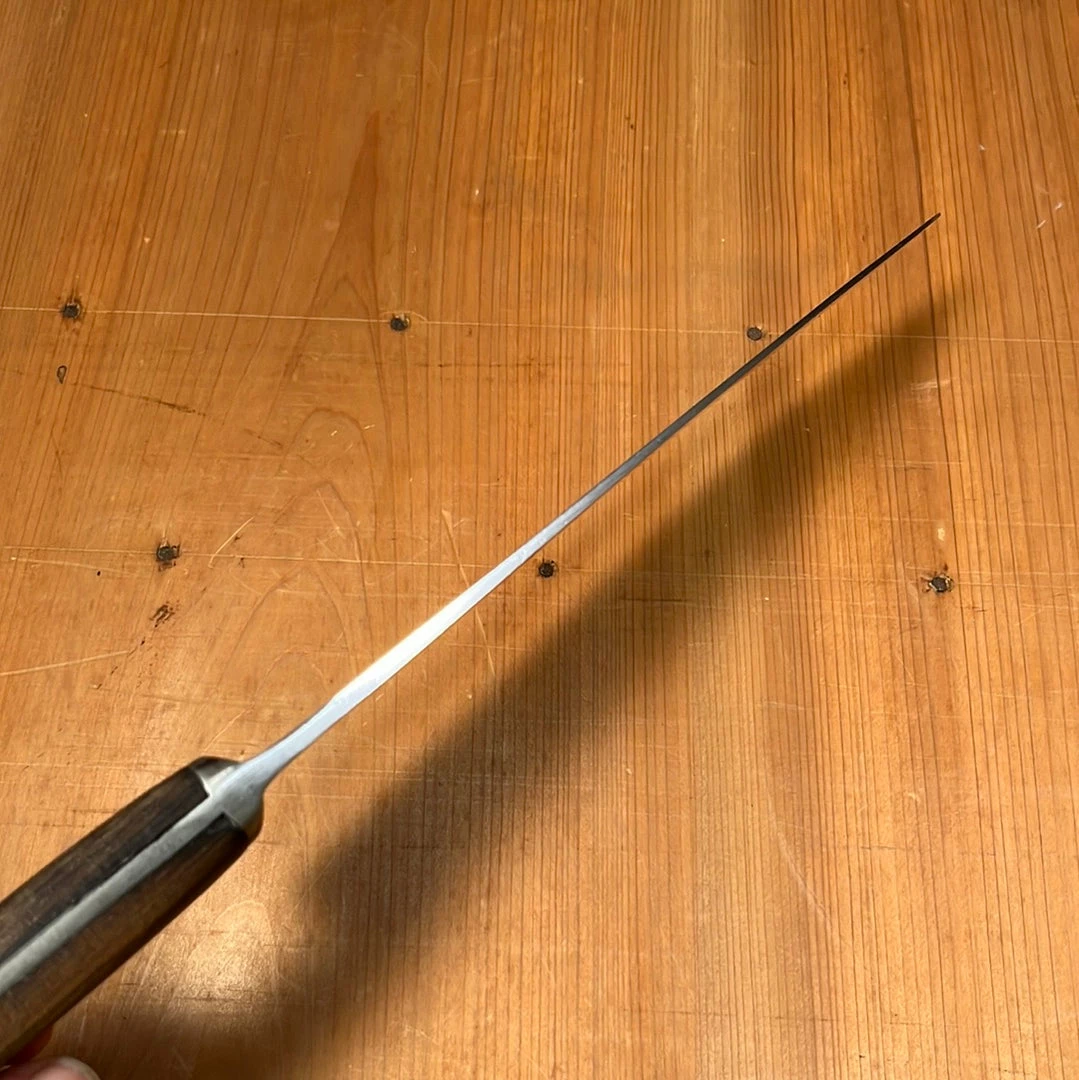 Hand forged after drop forged hand ground carbon steel 8.75″ chef knife made in Massachusetts by the venerable Dexter company. Before they were known for their economical stainless knives (especially with the white plastic handles) Dexter was the Harrington Cutlery company which was then named Dexter after Mr Harrington’s son. They are one of the USA’s oldest knife making firms with their roots along the Green River in Massachusetts shared with some of the USA’s finest old knife making.