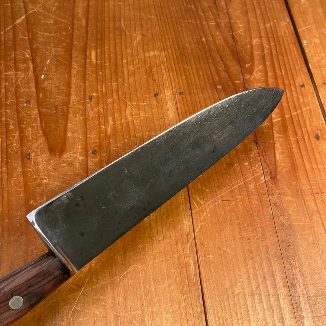 Hand forged after drop forged hand ground carbon steel 8.75″ chef knife made in Massachusetts by the venerable Dexter company. Before they were known for their economical stainless knives (especially with the white plastic handles) Dexter was the Harrington Cutlery company which was then named Dexter after Mr Harrington’s son. They are one of the USA’s oldest knifemaking firms with their roots along the Green River in Massachusetts shared with some of the USA’s finest old knife making.