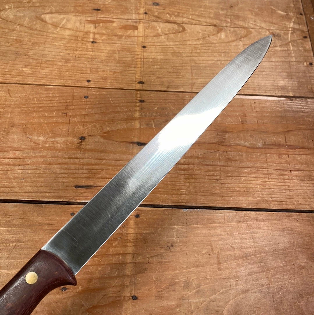 Vintage Friedr Herder Constant series hand ground stainless steel 9” slicer made around the 1960’s. These were an excellent hand ground thin convex faced stainless knife for their day and are great examples of mid century design. Stainless blade with pakka wood handle with famous spade rivet.