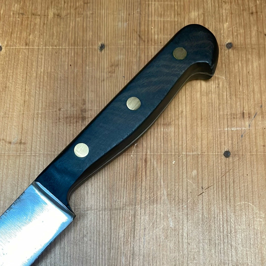 Drop forged and hand ground (and hand ground again) German slicer from approximately the 1960’s (or early 70’s) judging from the non-forged straight tang and brass rivets but with solid wood handle scales. Hand ground carbon steel knives like this largely ended in the mid 1970’s in Solingen Germany being supplanted by stainless steel and less hand grinding. As the older skilled workers retired and the cost of labor rose hand grinding on carbon steel was no longer the norm in Solingen. Stainless steel became very popular and the bigger names in Solingen began to produce larger quantities of knives with less hand work.