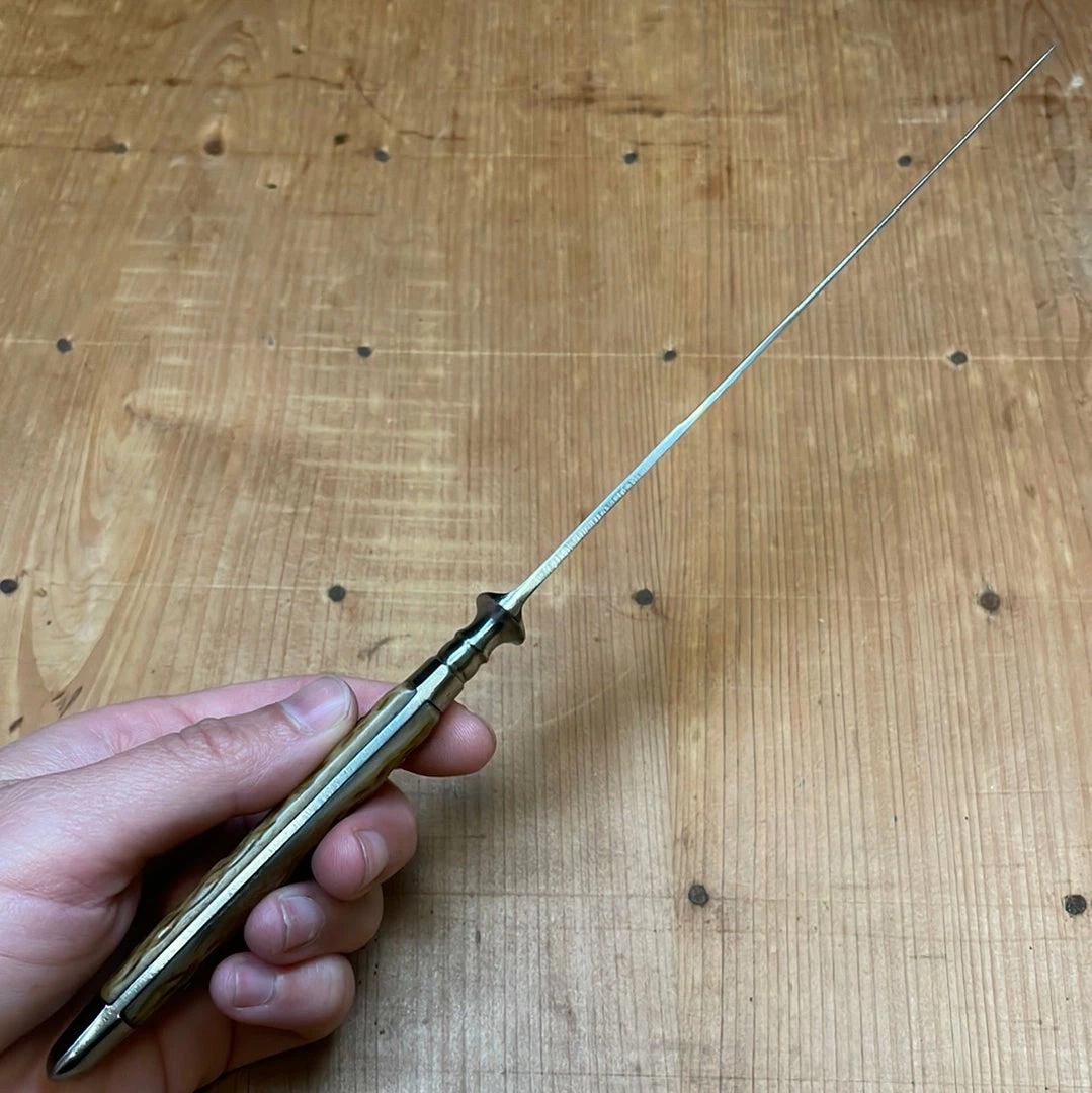 H Boker Solingen 6″ forged carbon steel slicer with jigged bone handle. This is a style of drop forged construction that is still used today in Solingen that began when drop forging was adopted in the 1870’s. This blade was origainally hand ground after being drop forged and has been refurbished to be more similar to it’s original geometry; a convex faced side to the blade.