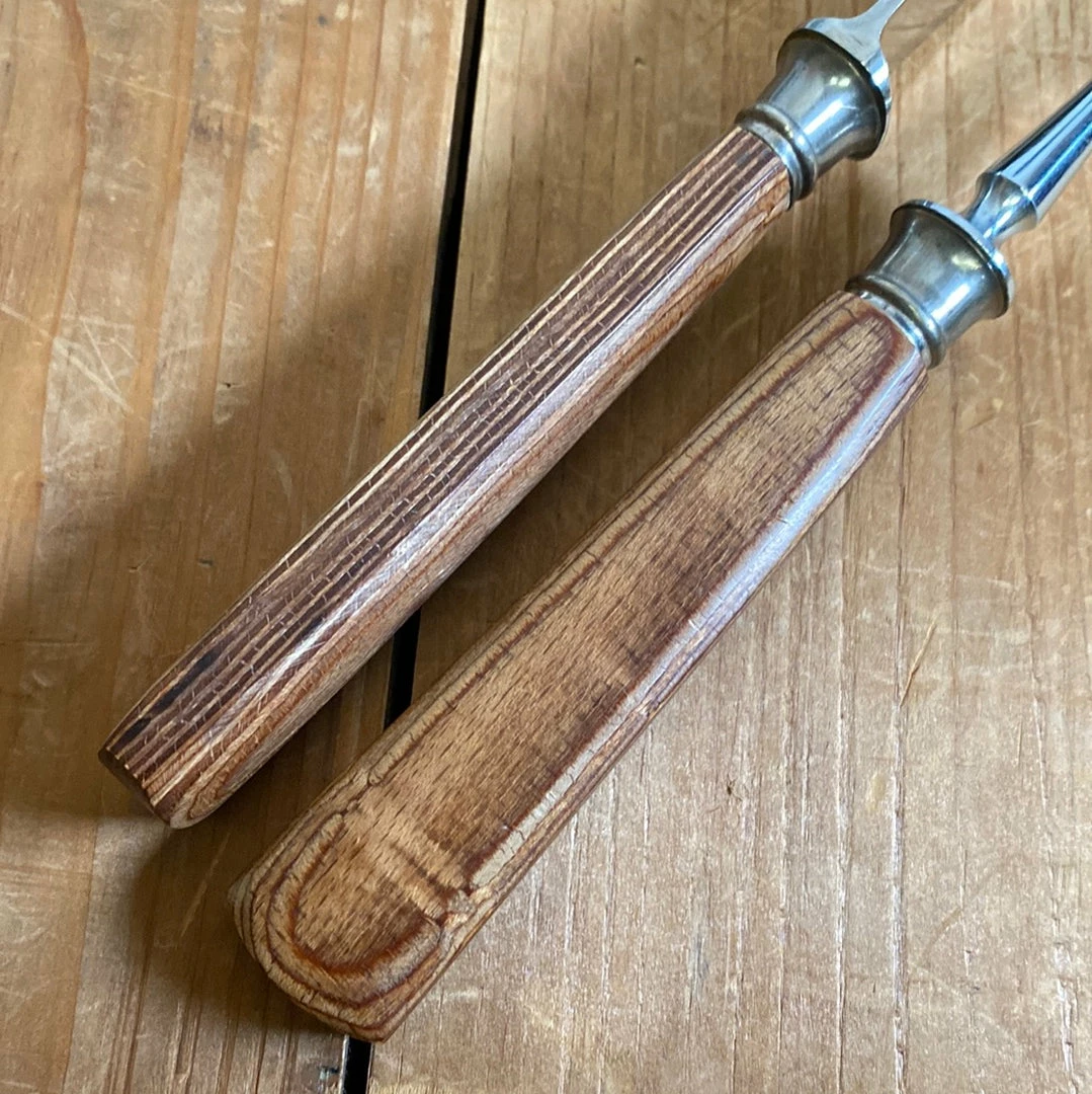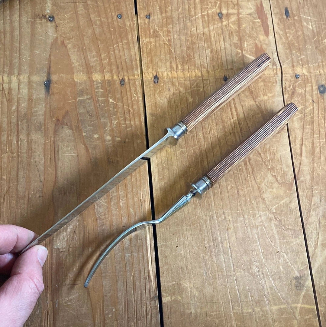 Set is in in barely used excellent condition, forks tines are all straight, knife edges show very little dulling and composite wood handles do not show de-lamination or damage from water.ย