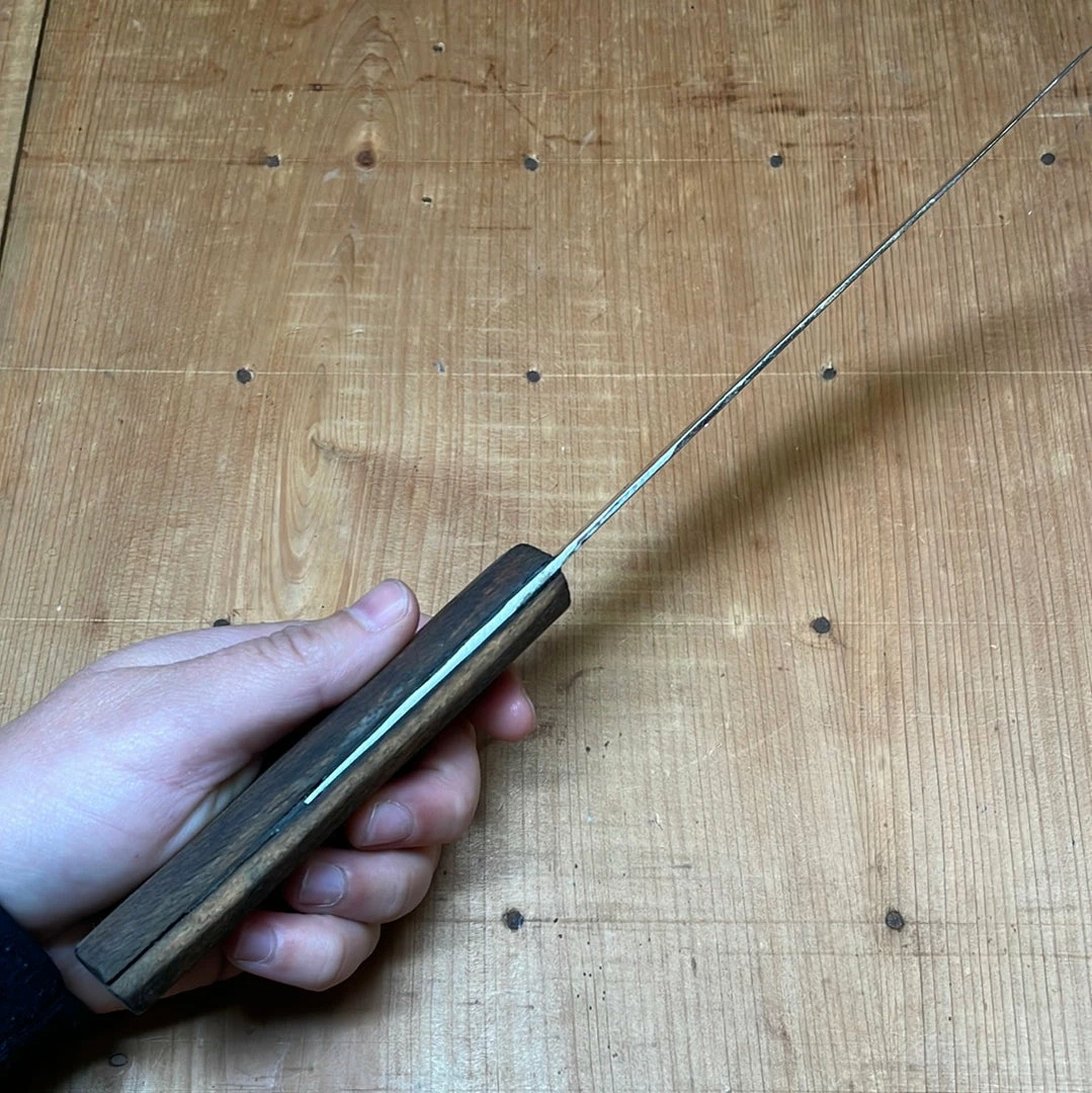 This knife has been re-ground and thinned behind the edge on a large 3 foot diameter Japanese water stone wheel (kaiten mizu toishi) and then resurfaced with a medium fine finish, our take on an old style grinding and finishing technique. While the particular wheel used to refurbish this knife is typically used in Japanese knife making it is very similar to the old grinding wheels used to shape European and American hand ground cutlery. A convex face to a blade greatly increases a knife’s performance as there is less sticking as there is on a flat face and the blade does not get thick behind the edge nearly as fast as with a flat faced blade. Being that we are often working with old blades that need re-shaping and might have been rusted expect some minor imperfections, we try to give a fresh start to our re-ground blades with an eye towards their original grind style and keeping as much metal is needed on a blade when ever possible. Check out Bernal Cutlery co founder Josh Donald’s book Sharp to see these wheels in use and more about their history in Europe and Japan.