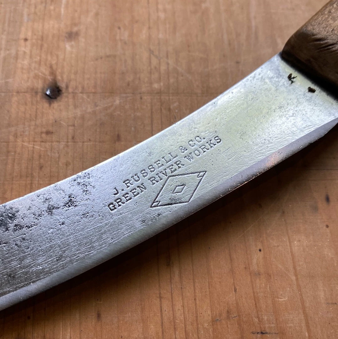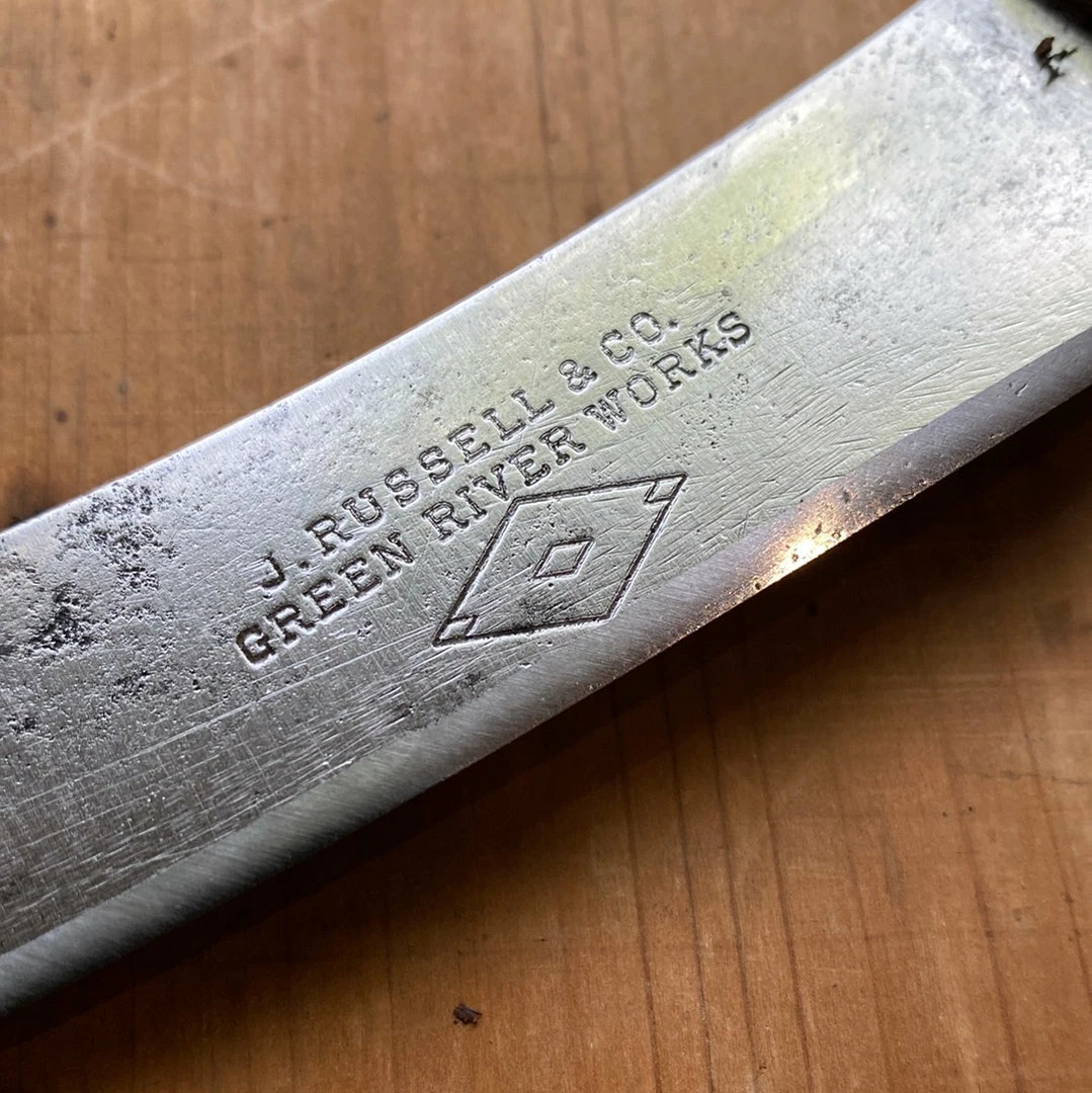J Russell Green River Works 6” skinner with Russel with straight serif markings which suggest 1884-1930’s manufacture.