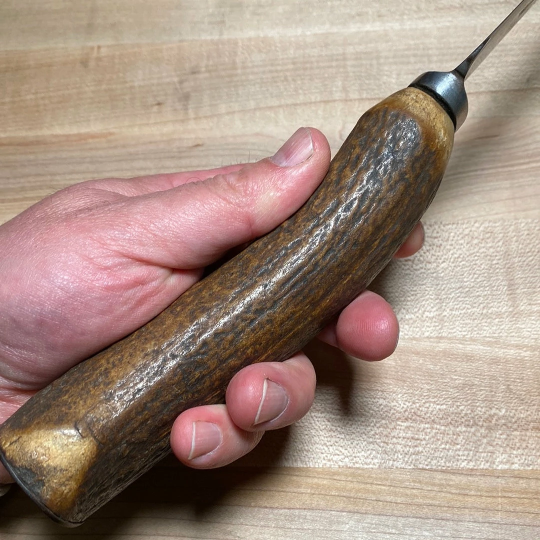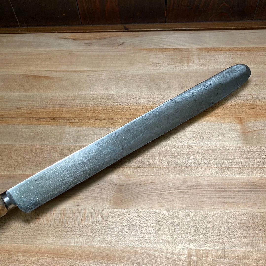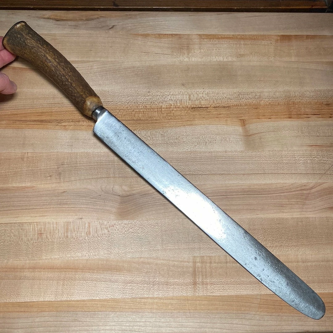 Antique J Smith 14″ English roast beef carving knife with shear steel blade and stag handle with iron butt cap.