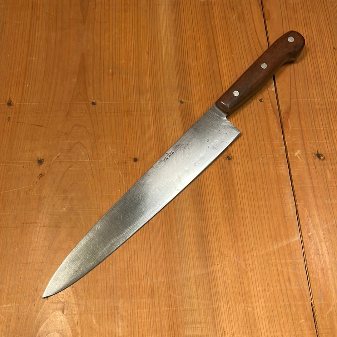 Knife has been sharpened down from a chef knife width and re-handled and the pommel ground into a rounder than original shape. Tropical hardwood with aluminum rivets.