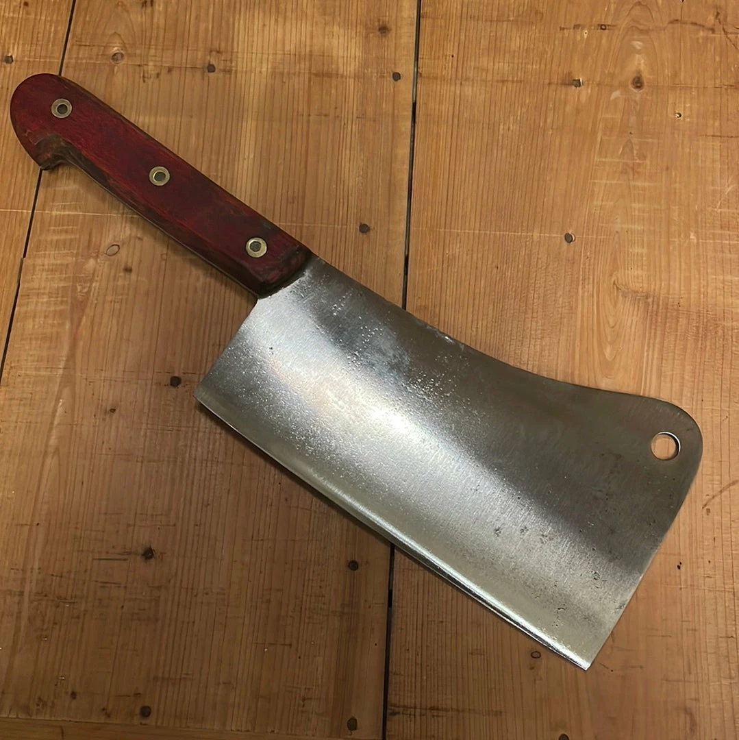 Vitnage Le Cobaye (guinea pig) carbon steel butcher cleaver with 7.25โ carbon steel blade and dyed red beechwood handle set with birdseye rivets.ย