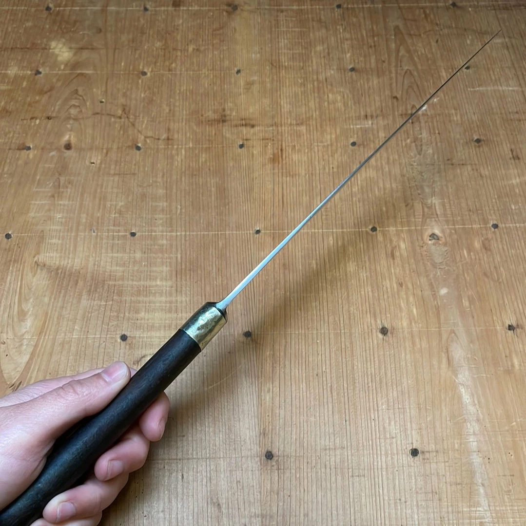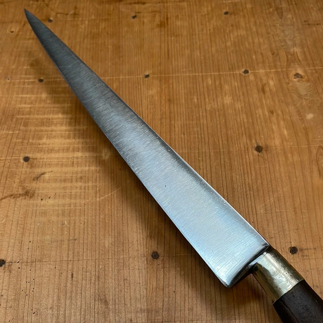 An old one here, it is on it’s 8th life but still has some juice left. This slicer originally started as a 10″ I would wager and has been sharpened down a lot. the handle has worn from many decades of use and theres some dings to the ferrule, but everything is still solid and the blade has a new fresh thinning.