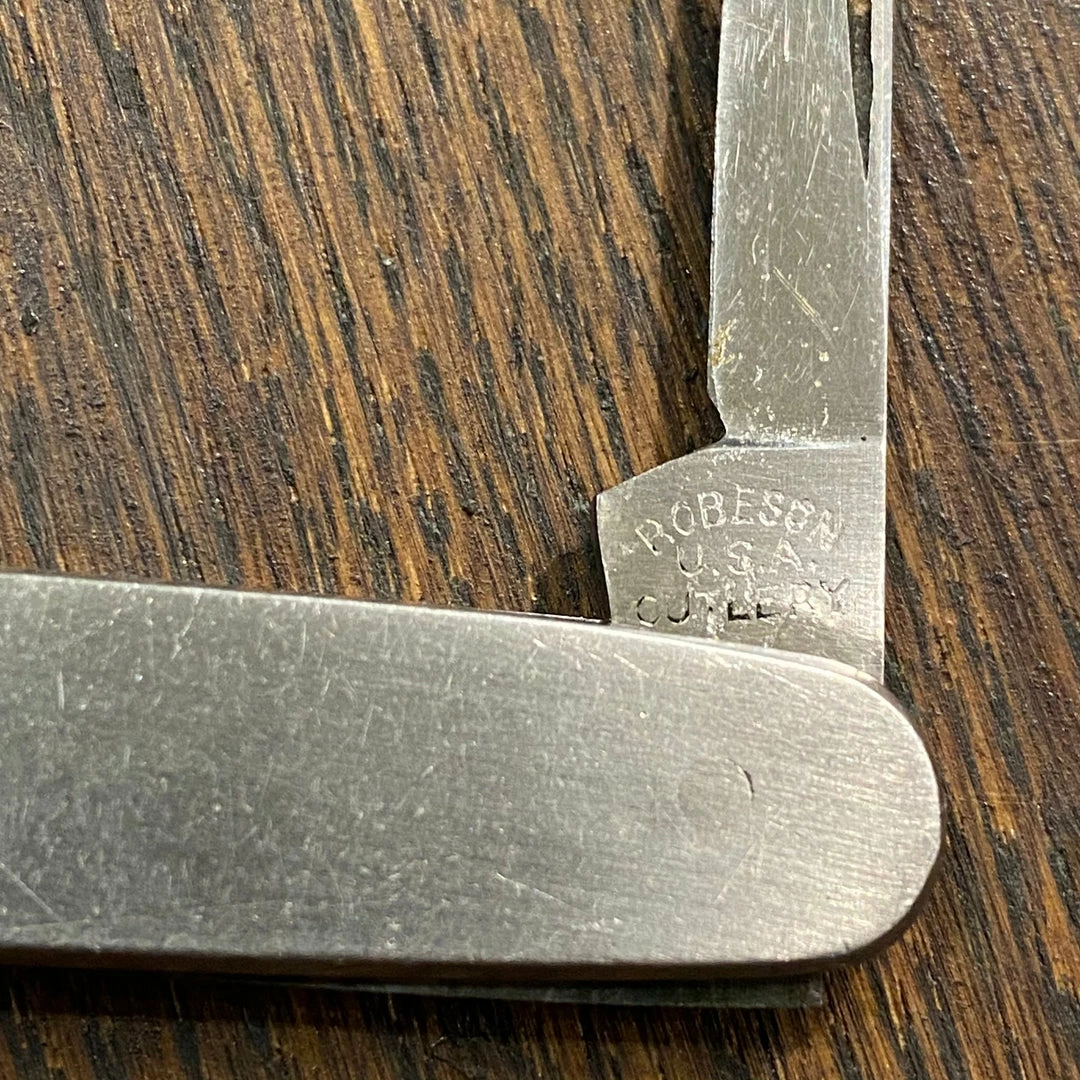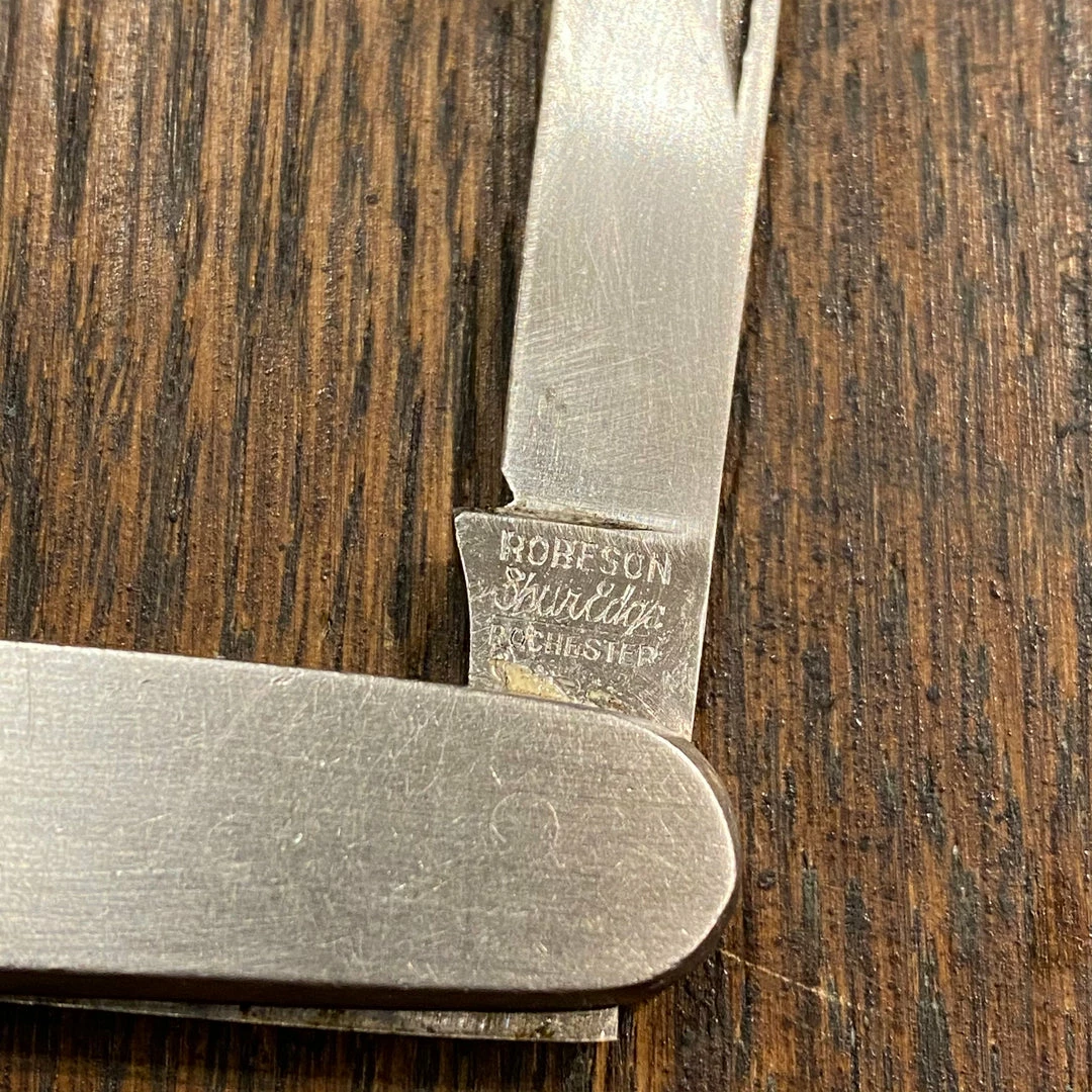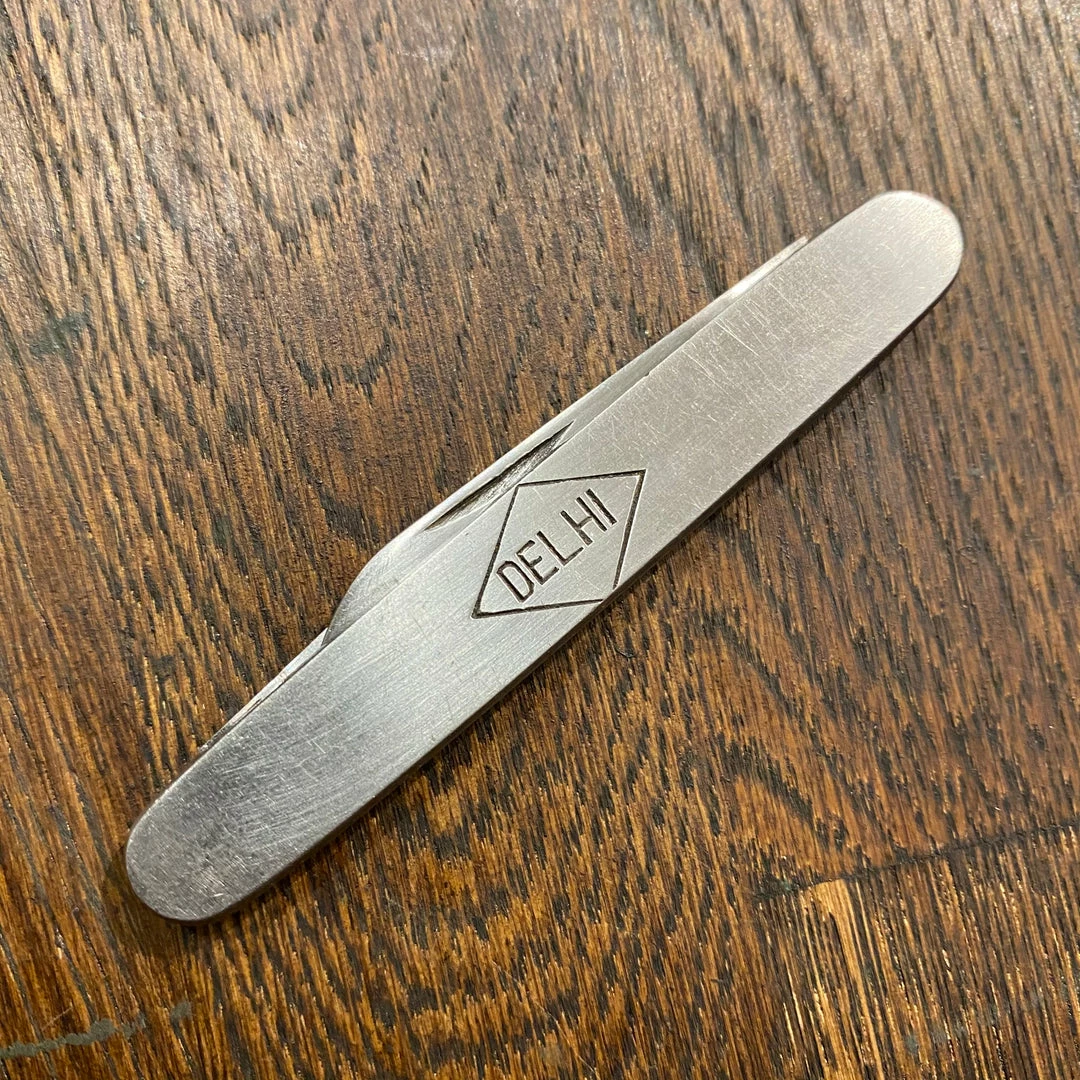 Robeson Shuredge 3” pen knife with stainless blades, nickel bolsters marked Delhi. The range of production of knives marked Robeson Shuredge is from 1922 to 1977. An identical knife with a different promotional company logo dated this make to 1938 at the latest, this might also be from that same time or a little later.