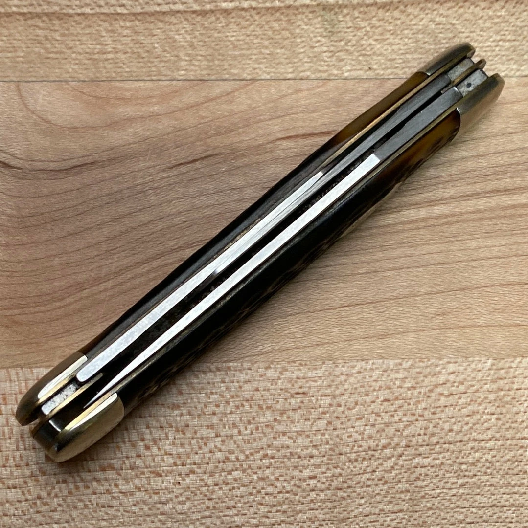 Schrade USA 3.5โ stockman pattern knife in great used condition, stainless blades with perfect mechanical operation and very little sharpening, composite โdelrinโ handles, nickel bolsters and brass liners.