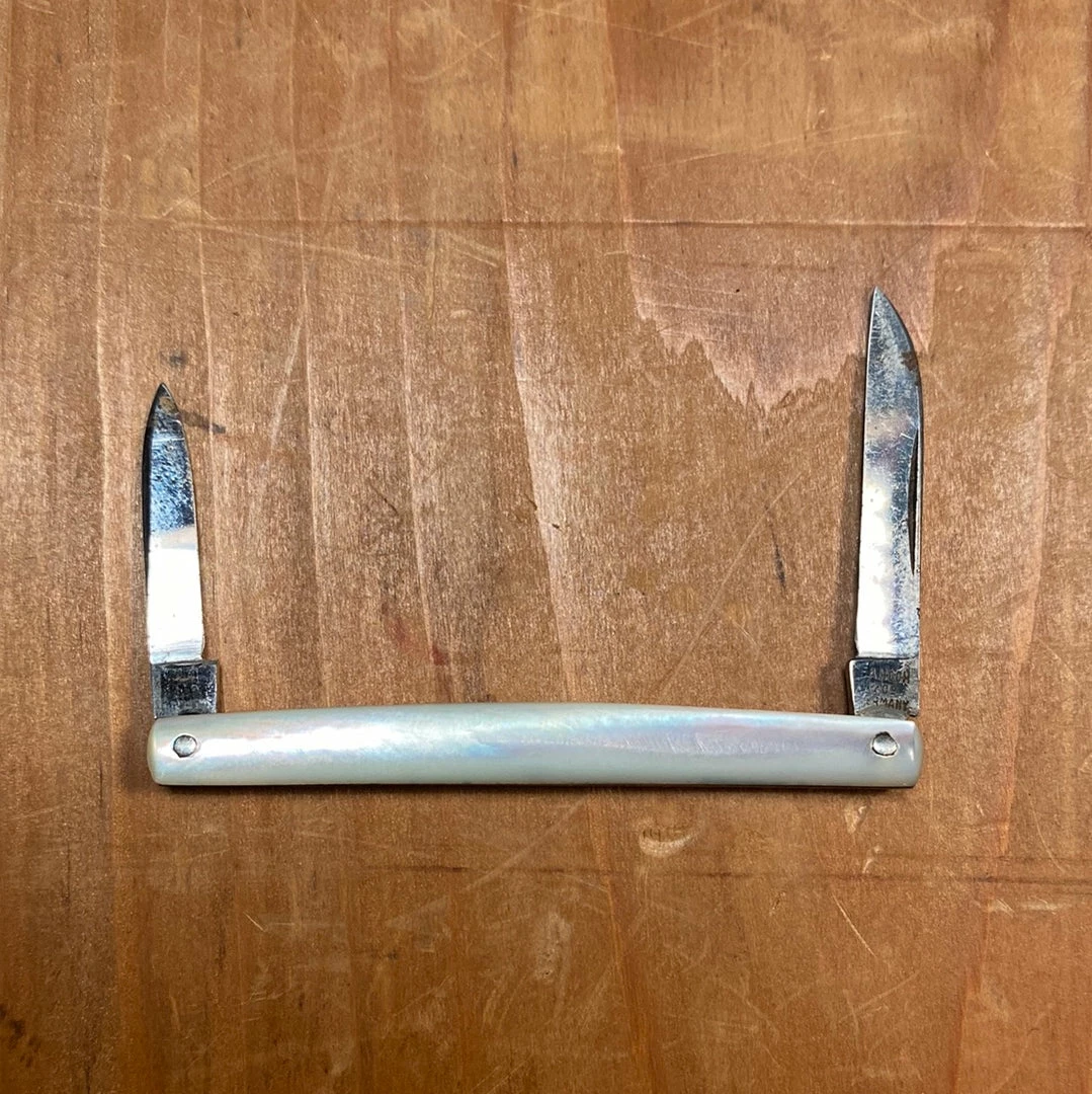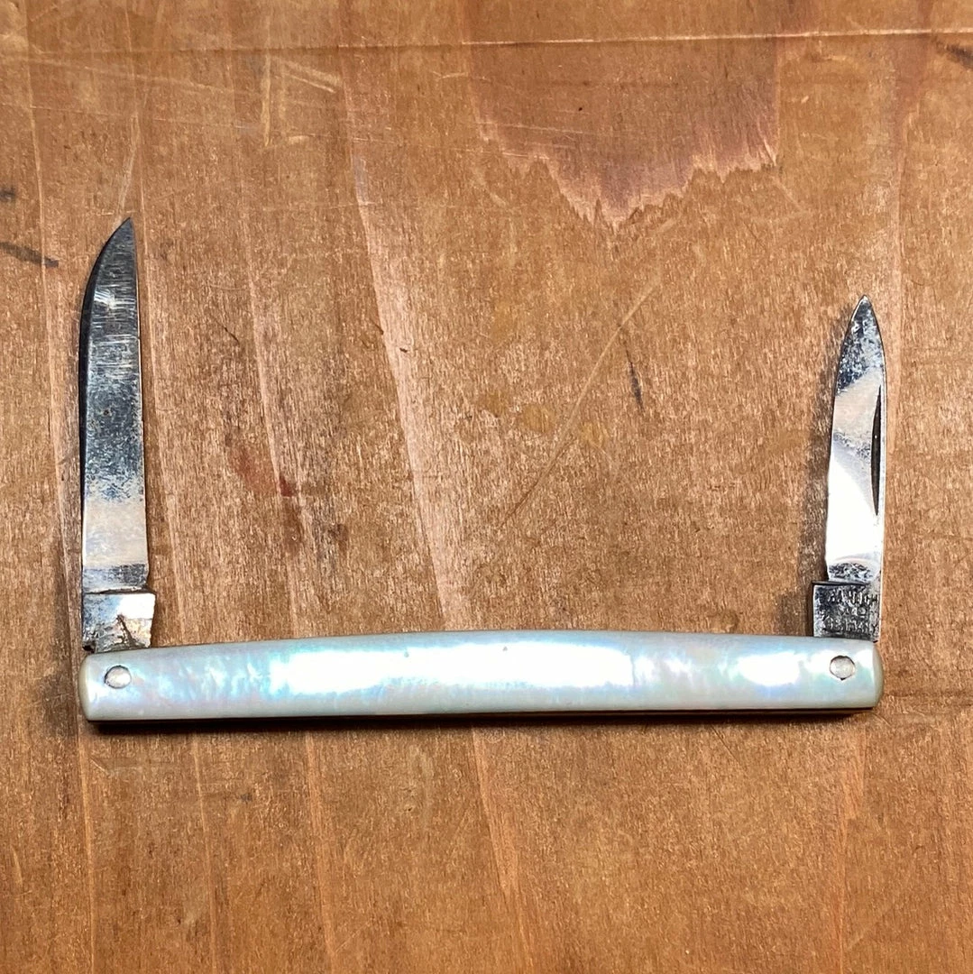 Small graceful pearl handled F.A. Koch pen knife in excellent condition. Carbon steel blades have not been sharpened, they have a few tiny rust spots but nothing serious. Pearl is nice and bright.