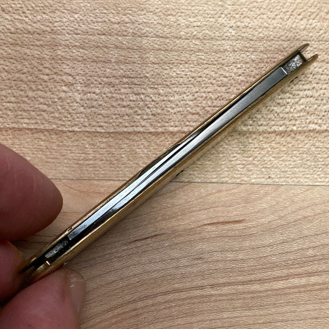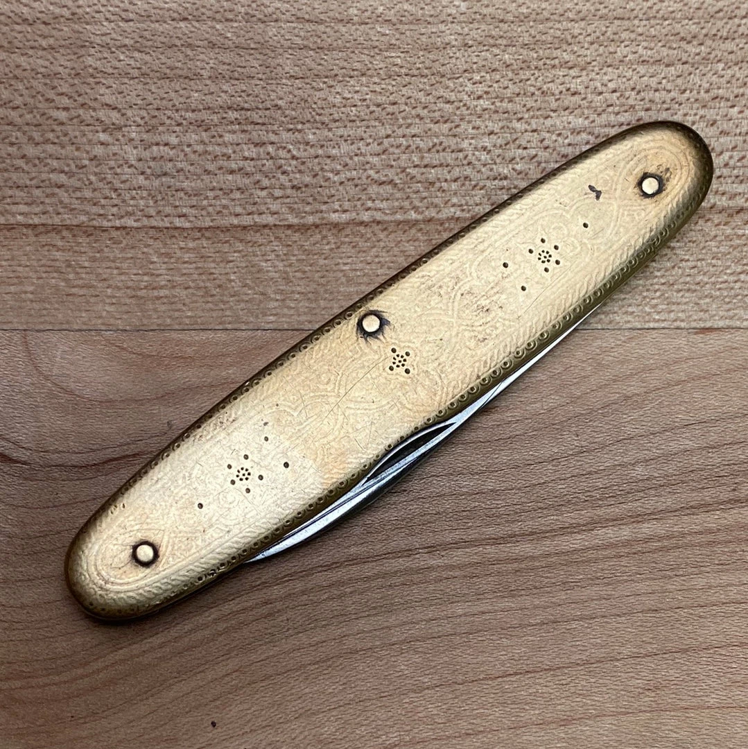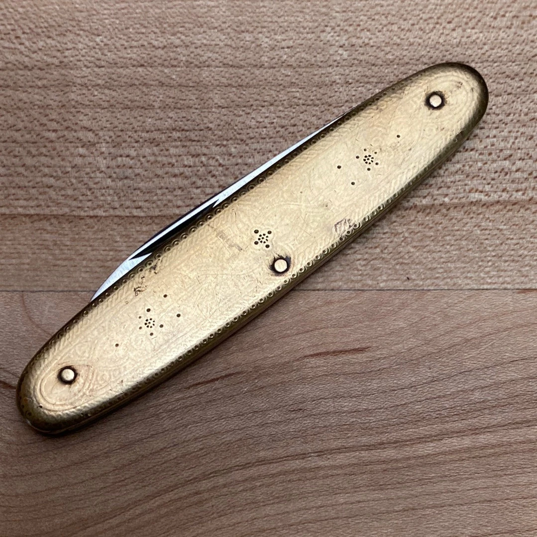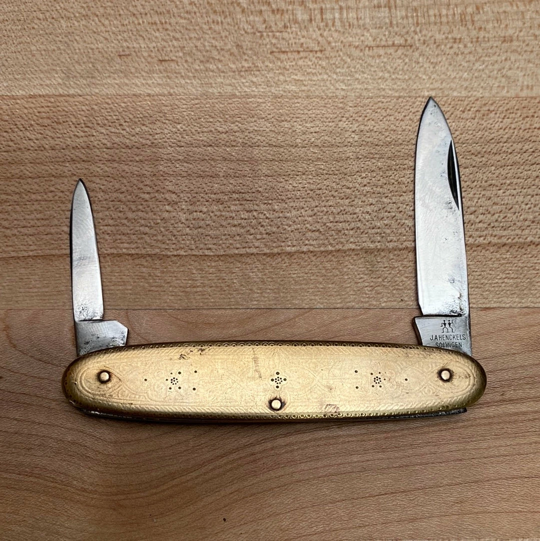 Old J.A. Henckels 3 3/8” pen knife with carbon steel blades, brass hafts that once had a cloisonné enamel design. Blade stamps lack ‘Germany’ but do include Solingen which suggests pre 1891 manufacture as Henckels exported a lot to the USA and should have included ‘Germany’ after 1891. The marking of the twins are thinner and more square like the 19th C markings as well. However I cannot verify this, just an educated guess, this could be more recent but the 1960’s is the cut off period for Henckels folders.