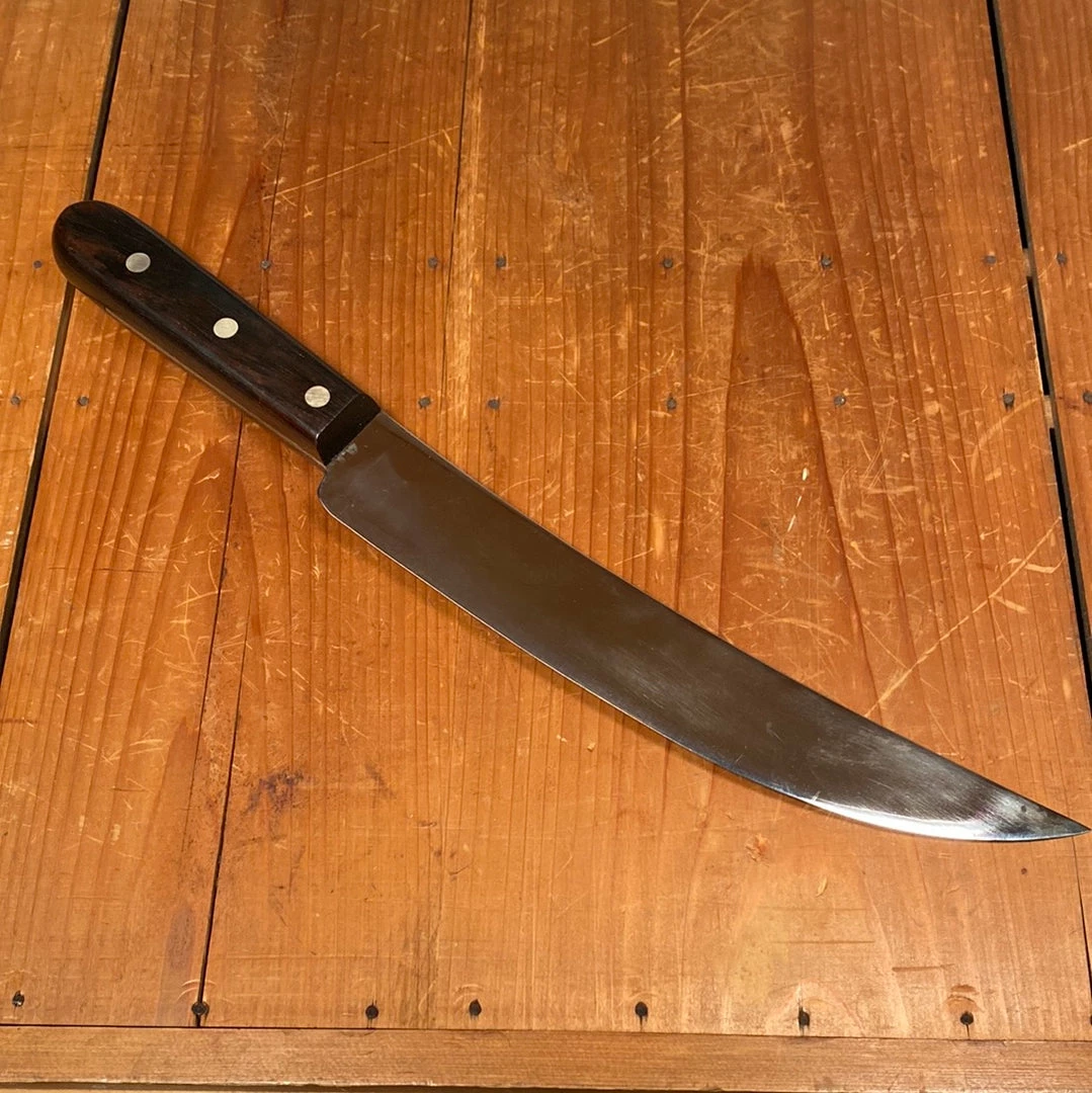Unused Dexter hand ground carbon steel mirror finished carbon steel and rosewood 10″ scimitar from the 1950’s to 70’s.