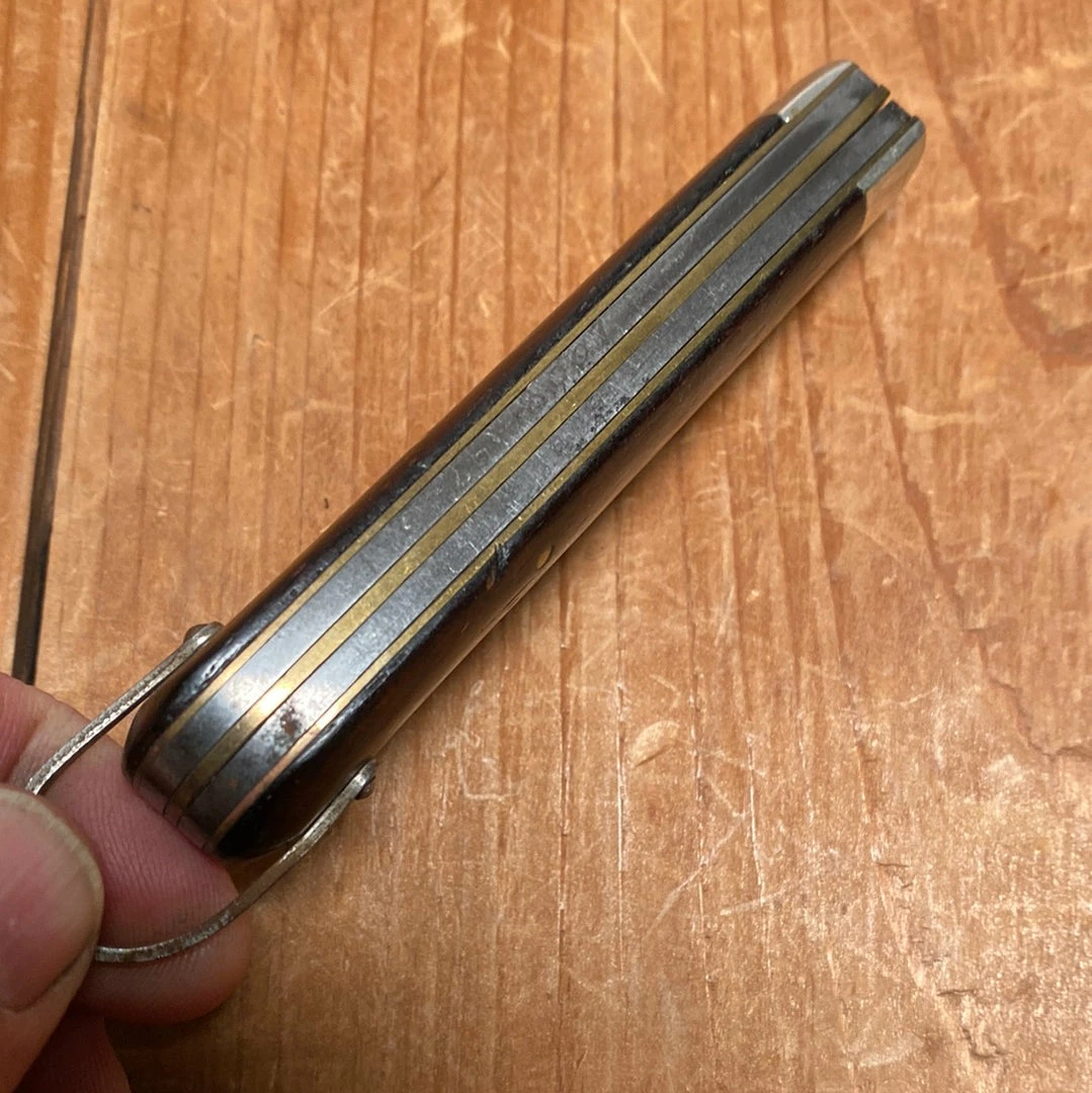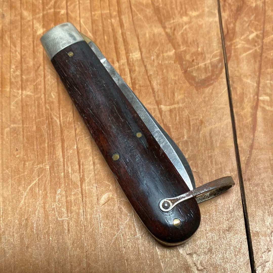 3.75โ closed Schrade Walden electricians knife with carbon steel blades (liner lock on the screwdriver / wire stripper blade), rosewood hafts and old style nickel โbowtieโย shield. This marking of Schrade knives dates it to 1946 to 1973 manufacture but the style of grinding on blade and shield suggests earlier range of 46-73 manufacture.ย