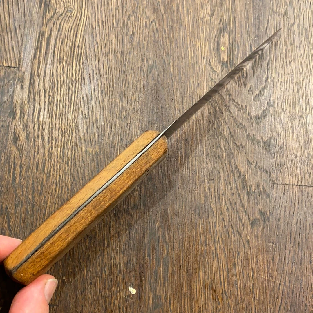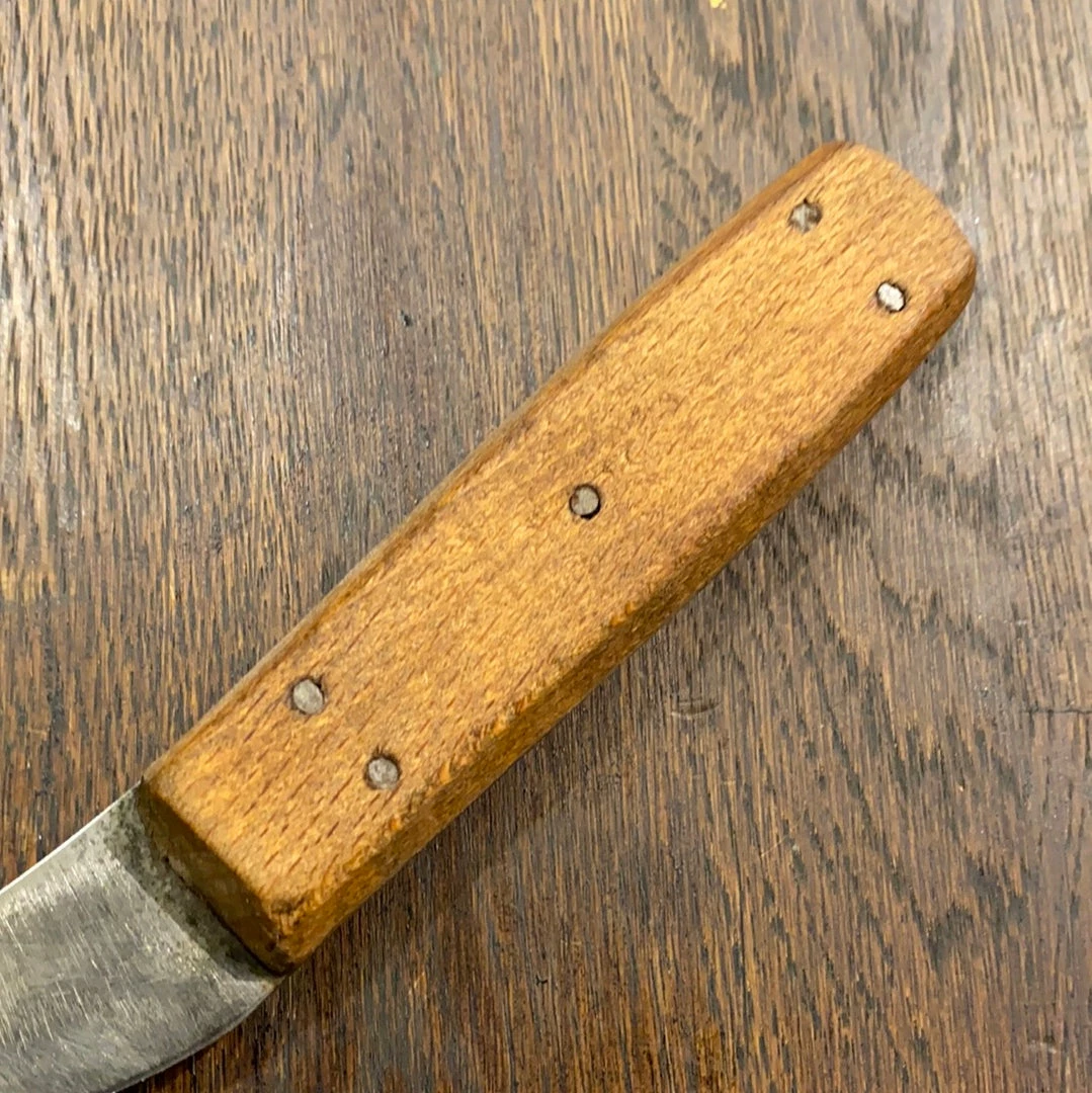 Vintage / Antique hand forged skinning knife with steel riveted beech handle. Blade has been sharpened down a bit, these were found in a batch of other butchery knives in San Francisco, some with San Francisco butchery supply business markings suggesting these were part of the S.F. โButchertownโ butchery industry. This one is likely 1890โs to 1920โs given itโs hand forged blade and steel pins, at the very latest it would be 1930โs era production, it was found with a batch of knives all from 30โs era.