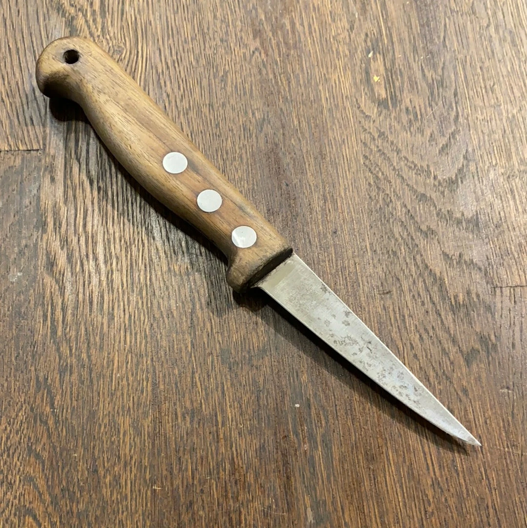 Unmarked but certainly German (Henckels?) 3.75โ boning knife. The carbon steelย blade has been skillfully thinned from a slightly larger (5โ?) blade that had been sharpened down, it does not have the geometry or feel of a sharpened down knife but most likely is.ย