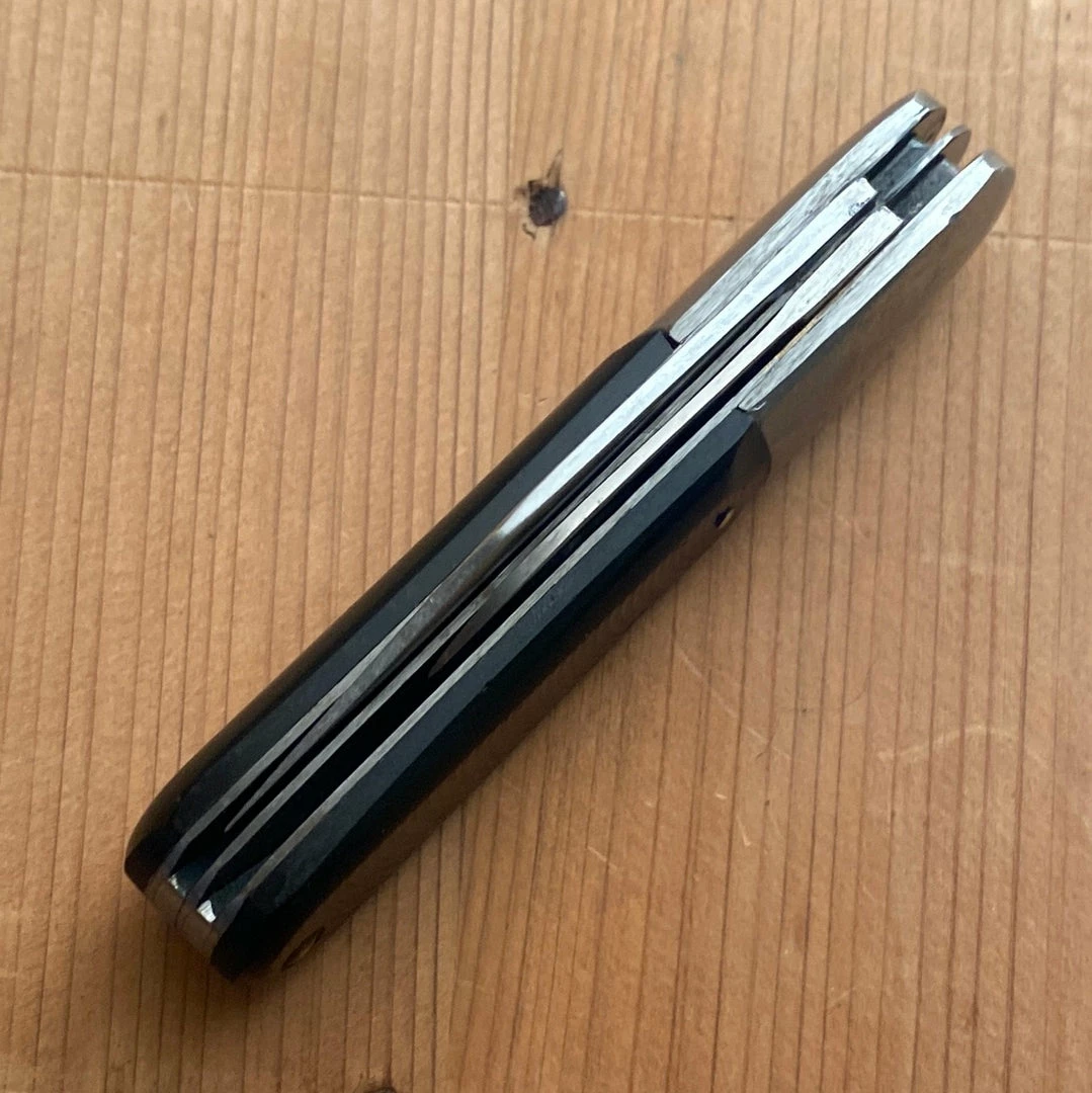 Main Blade has been sharpened in some and the spring is weak but no wiggles when open.ย