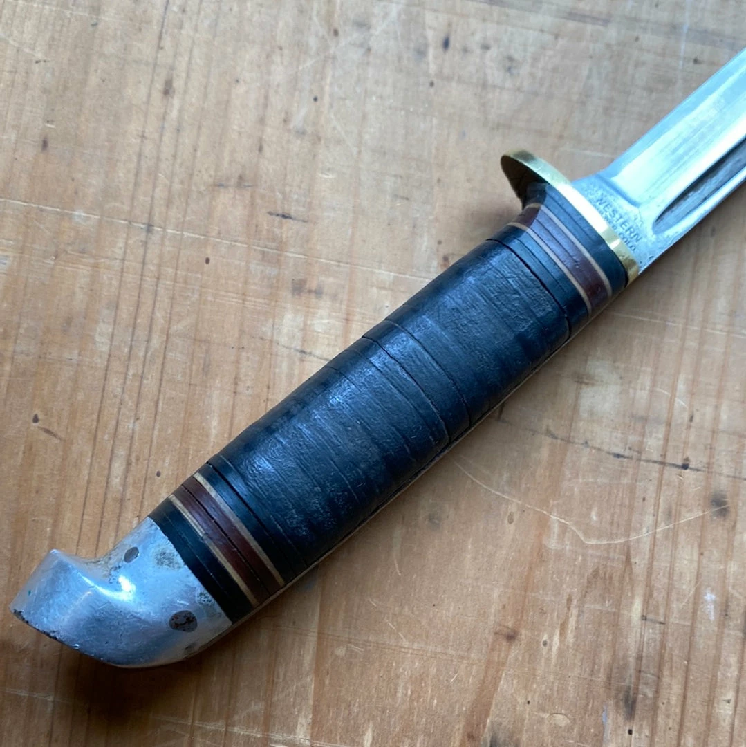 Western 4.25” ‘bird and trout’ knife made in the 1950’s or 60’s with carbon steel blade, stacked leather handle with vulcanized rubber spacers and aluminum pommel and leather sheath.
