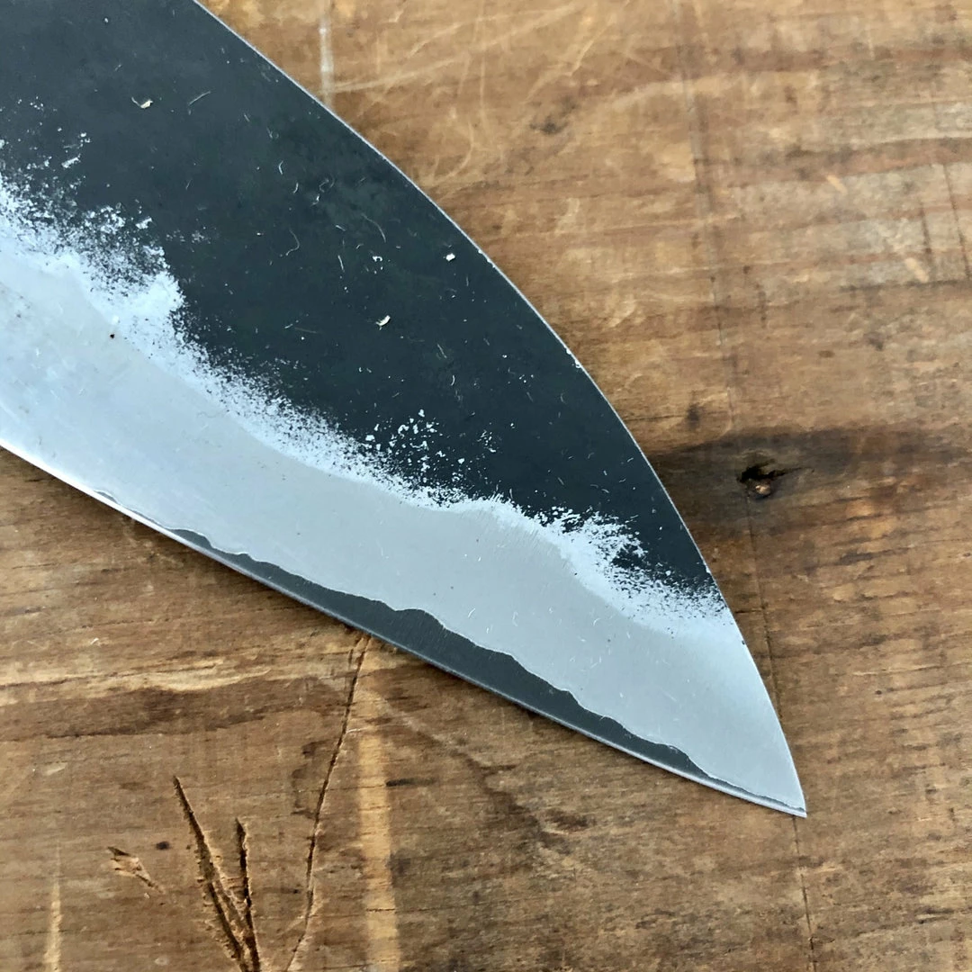 Blenheim Forge 170mm Funayuki / short chef knife, fumed oak and brass ferrule handle. Aogami Super carbon steel core with stainless steel cladding.