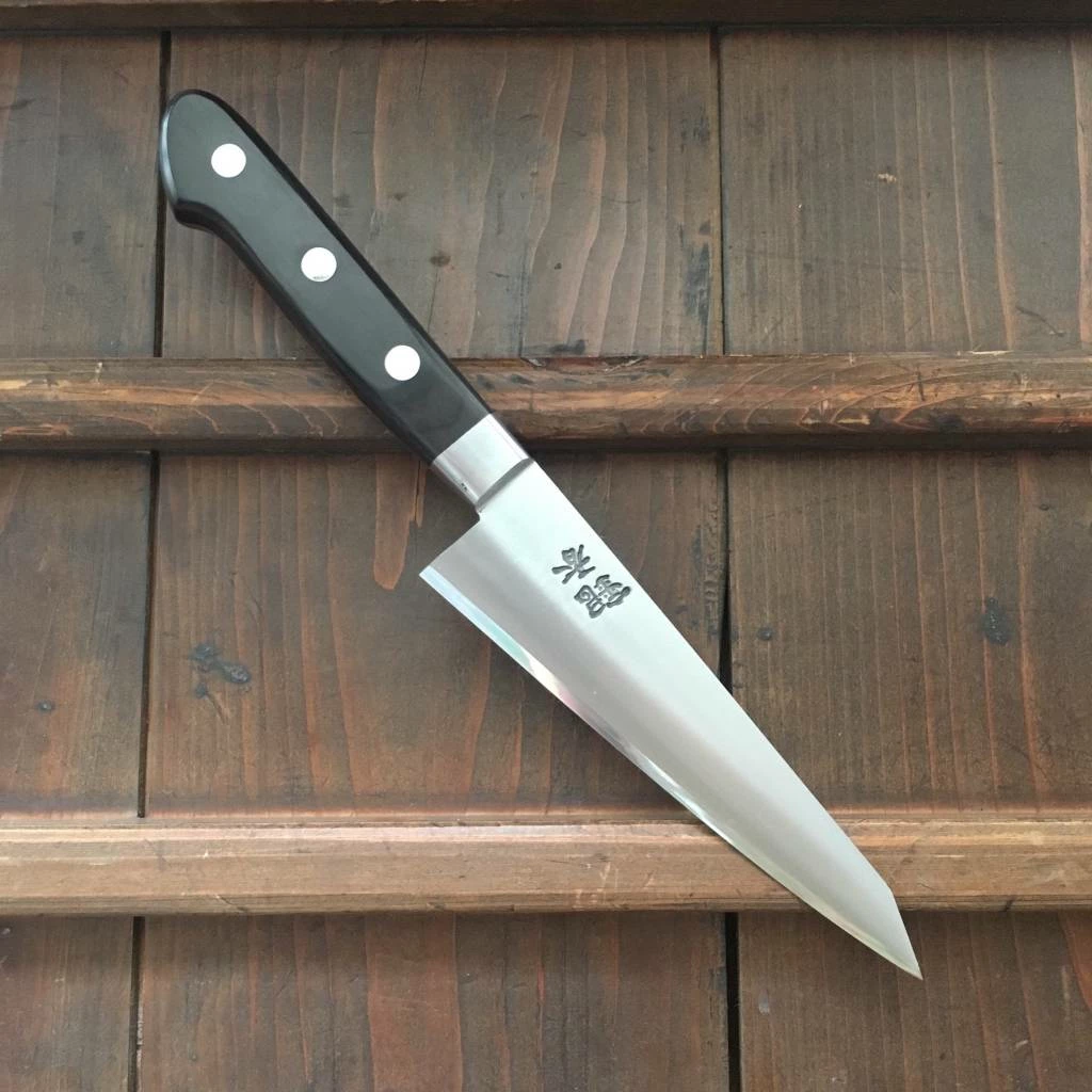 Ashi Hamono 150mm honesuki kaku with Shirogami #2 carbon steel blade and western style riveted pakka wood handle. Right Handed. Saya cover is included.