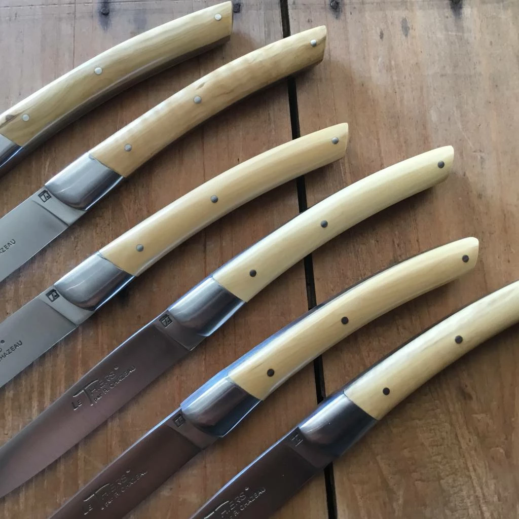 Chazeau Honoré ‘Le Thiers table / steak knives. 12c27 stainless steel blades. Boxwood handles and stainless bolsters. Set of 6. Blade is 4 1/2″ long and the overall length is 9 1/8″