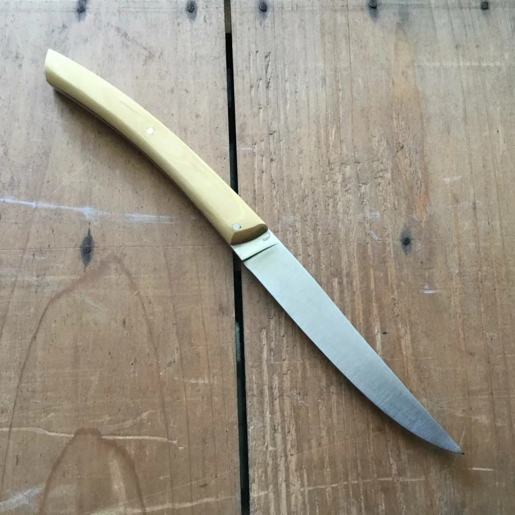 Chazeau Honoré ‘Le Thiers’ table / steak knives. 12c27 stainless steel blades with box wood handles. Set of 6. Blade is 110mm, overall lenth 230mm. 63 grams.