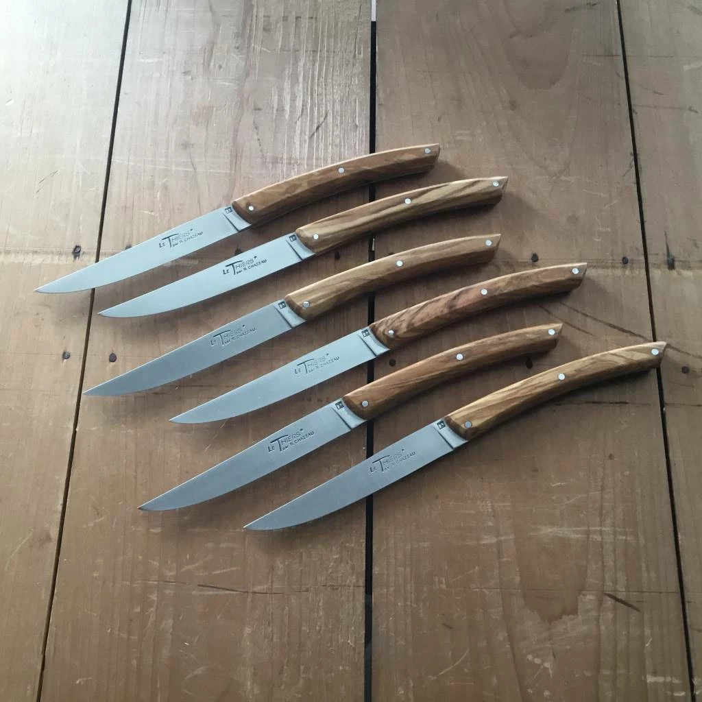 Chazeau Honoré ‘Le Thiers’ table / steak knives. 12c27 stainless steel blades with olive wood handles. Set of 6. Blade is 4 1/2″ long and the overall length is 9 1/8″