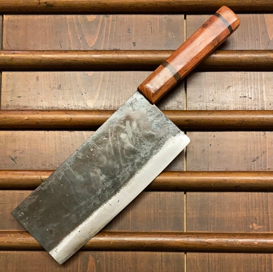Hand forged in Vietnam with German-made leaf spring carbon steel and handled with local hardwoods. These rustic mono-steel knives cut nicely and sharpen super easily. These great value knivesย often have slight imperfections and the handle tones will vary from knife to knife. Overall weight can also fluctuate up to =/- 5g. We inspect every knife for major flaws prior to shipping.