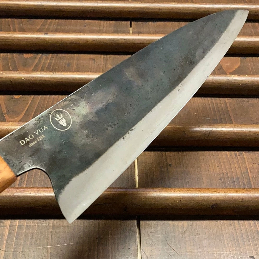 Hand forged in Vietnam with German-made leaf spring carbon steel and handled with local hardwoods. These rustic mono-steel knives cut nicely and sharpen super easily. These great value knivesย often have slight imperfections and the handle tones will vary from knife to knife. Overall weight can also fluctuate up to =/- 5g. We inspect every knife for major flaws prior to shipping.