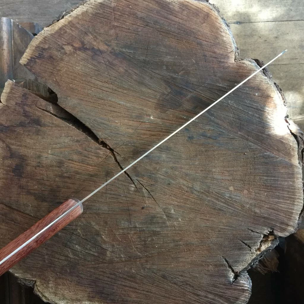 Dexter Russell 10″ bread knife, with a fine toothed serrated stainless blade and riveted rosewood handle. No dishwasher.