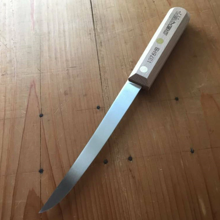 Dexter Russell #1376HB 6″ flexible ham-boning knife. Carbon steel with riveted beech wood handle. Made in USA.