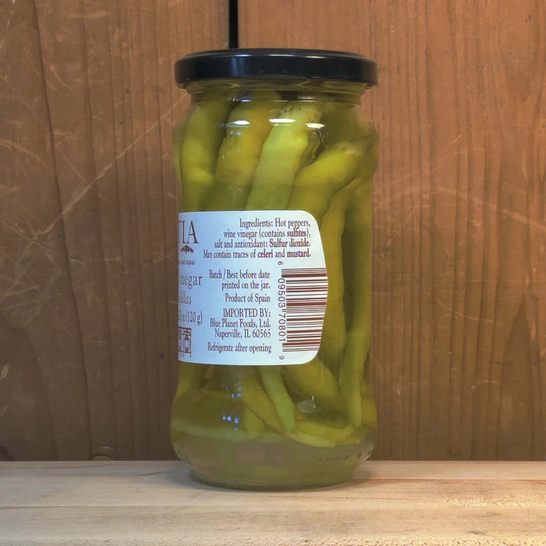 A traditional pepper of the Basque region, these guindilla peppers in wine vinegar are also referred to as piparras. Yellowish-green and narrow with an elongated shape, theyโre mild, spicy-sweet peppers that add a subtle heat to numerous Spanish dishes.