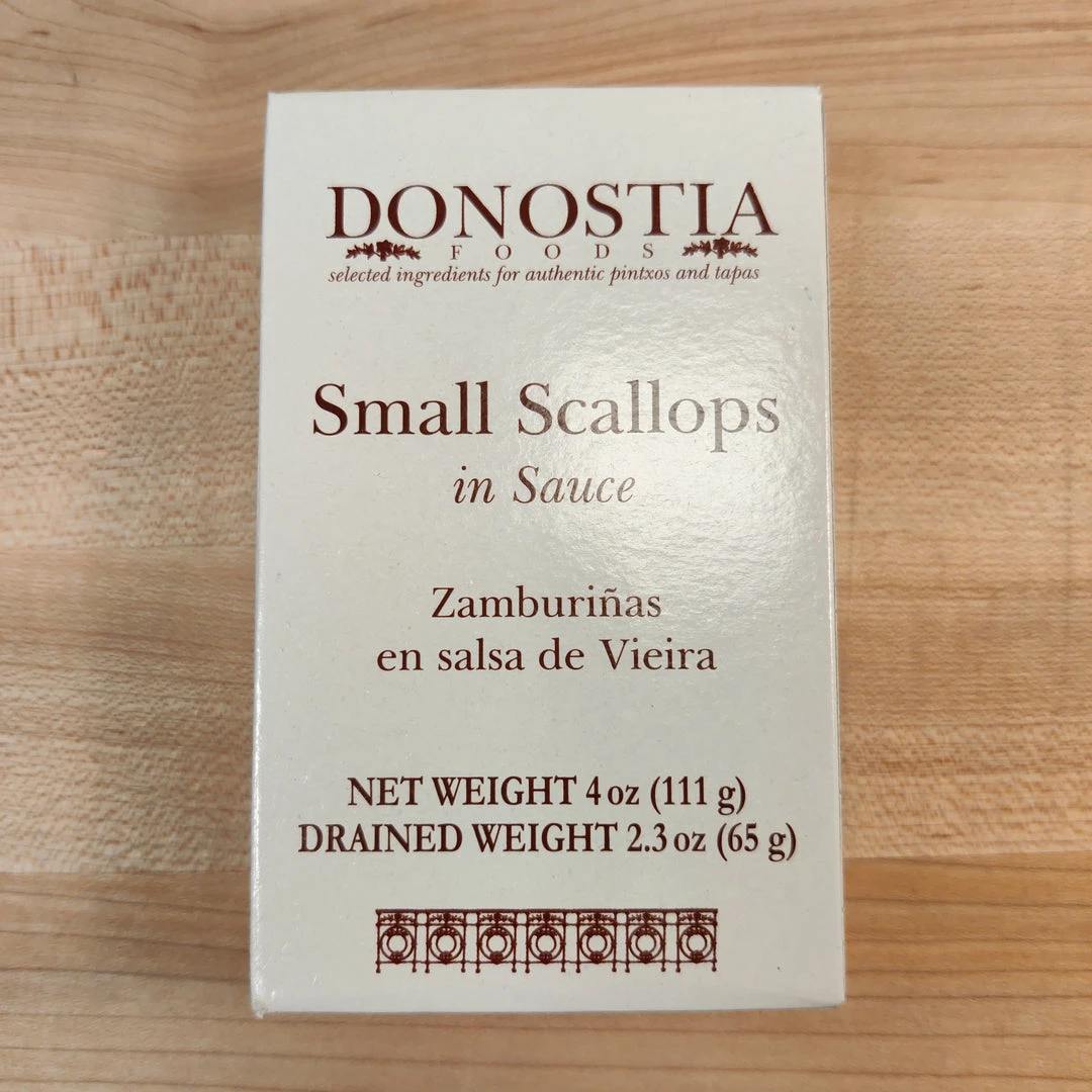 Donostia Foods Small Scallops in Sauce (Zamburiñas en salsa de Vieira), from the Atlantic waters off the coast in Galicia in northwest Spain. Serve warmed over rice or pasta for an easy dinner or get a little weird and enjoy with toaster hash browns and guindilla peppers (still easy, though).