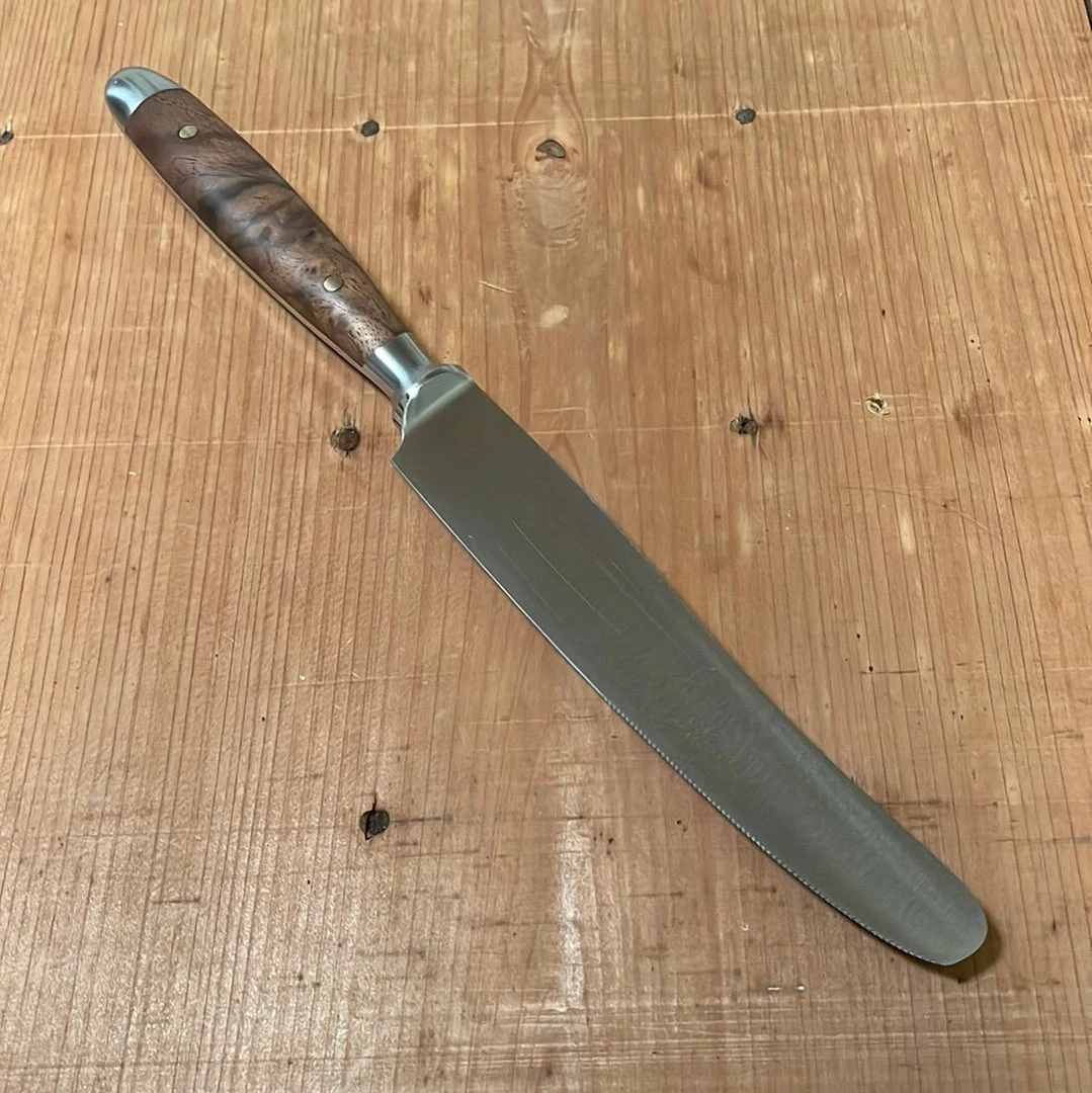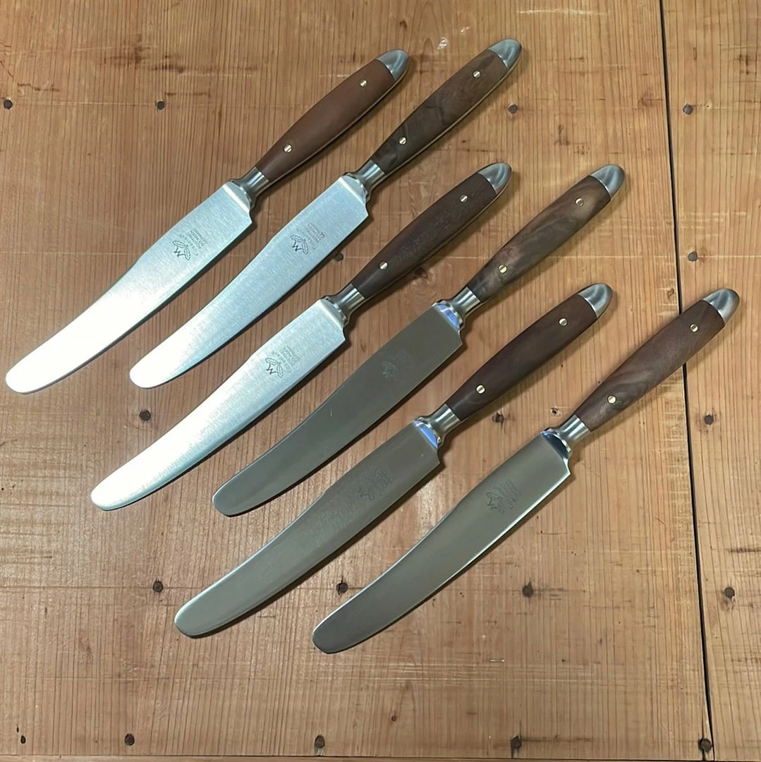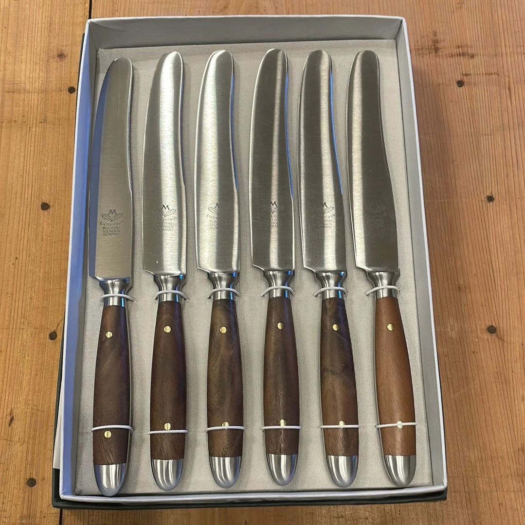 Six pieces of table length, ‘Old German’ forged steak knives in walnut, matte finish.ย Knivesย pictured are sold as a complete set and come with a box.