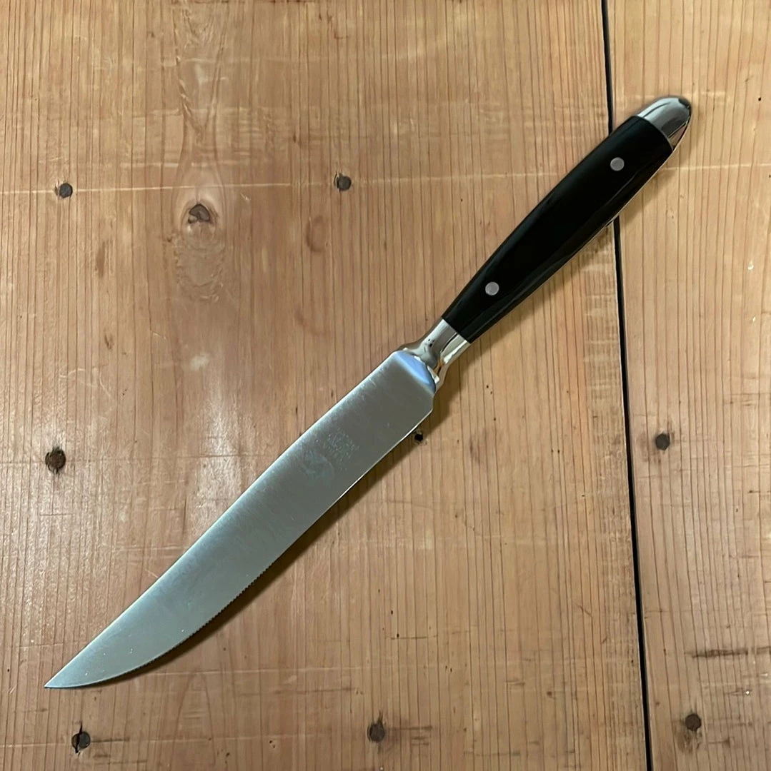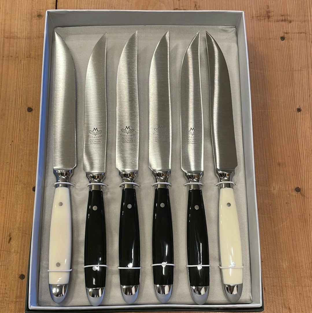 Six pieces of table length forged steak knives in white and black acrylic, polished finish.ย Knivesย pictured are sold as a complete set and come with a box.