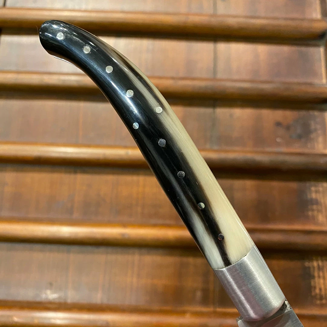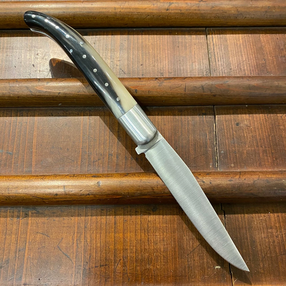 Hand made in France by Fontenille Pataud featuring a stainless blade, stainless bolster and hand filed spring.ย Handle is hafted in horn tip withย stainless rivets.