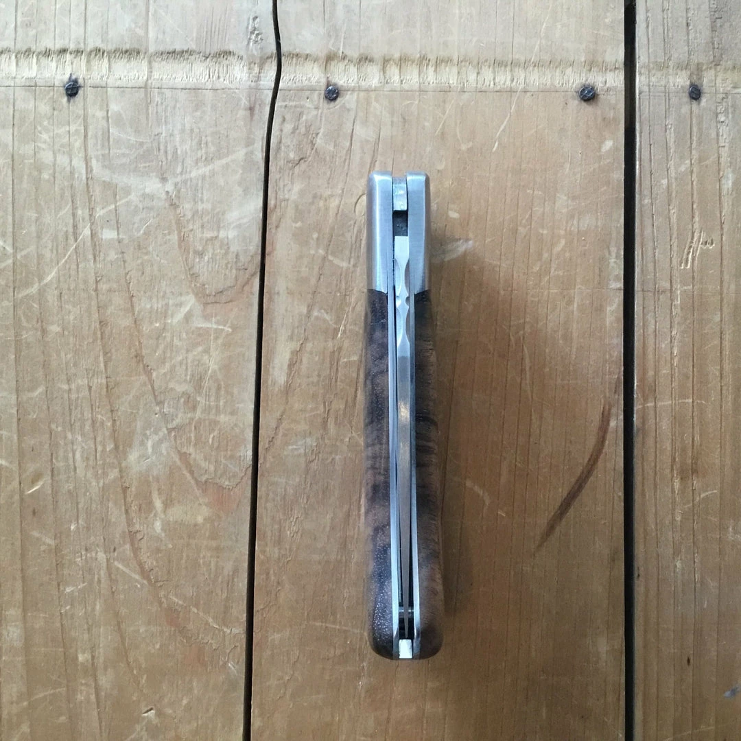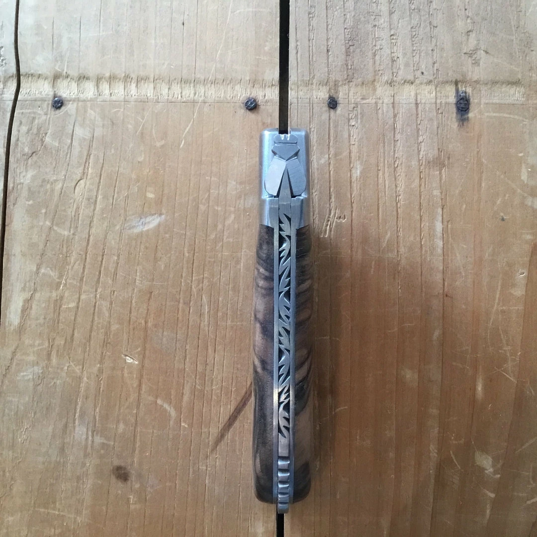 The Laguiole knife has a distinctive design influenced by the Spanish Navaja. A smaller, more tactile version was made for the sheep-herders on the Aubrac plateau in France, and was named after the town Laguiole. In addition to the iconic ‘bee’ or ‘fly’ on the spring, typically they feature a semi yataghan shaped blade, a slip joint mechanism with a slim tapered handle made from natural material, traditionally cow horn.