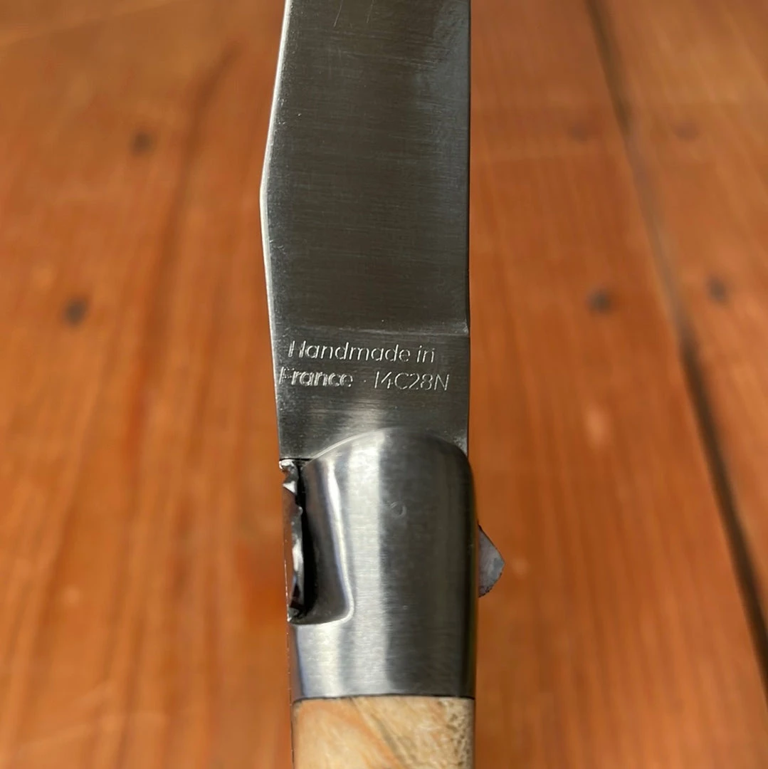 The Laguiole knife has a distinctive design influenced by the Spanish Navaja. A smaller, more tactile version was made for the sheep-herders on the Aubrac plateau in France, and was named after the town Laguiole. In addition to the iconic โbeeโ or โflyโ on the spring, typically they feature a semi yataghan shaped blade, a slip joint mechanism with a slim tapered handle made from natural material, traditionally cow horn.